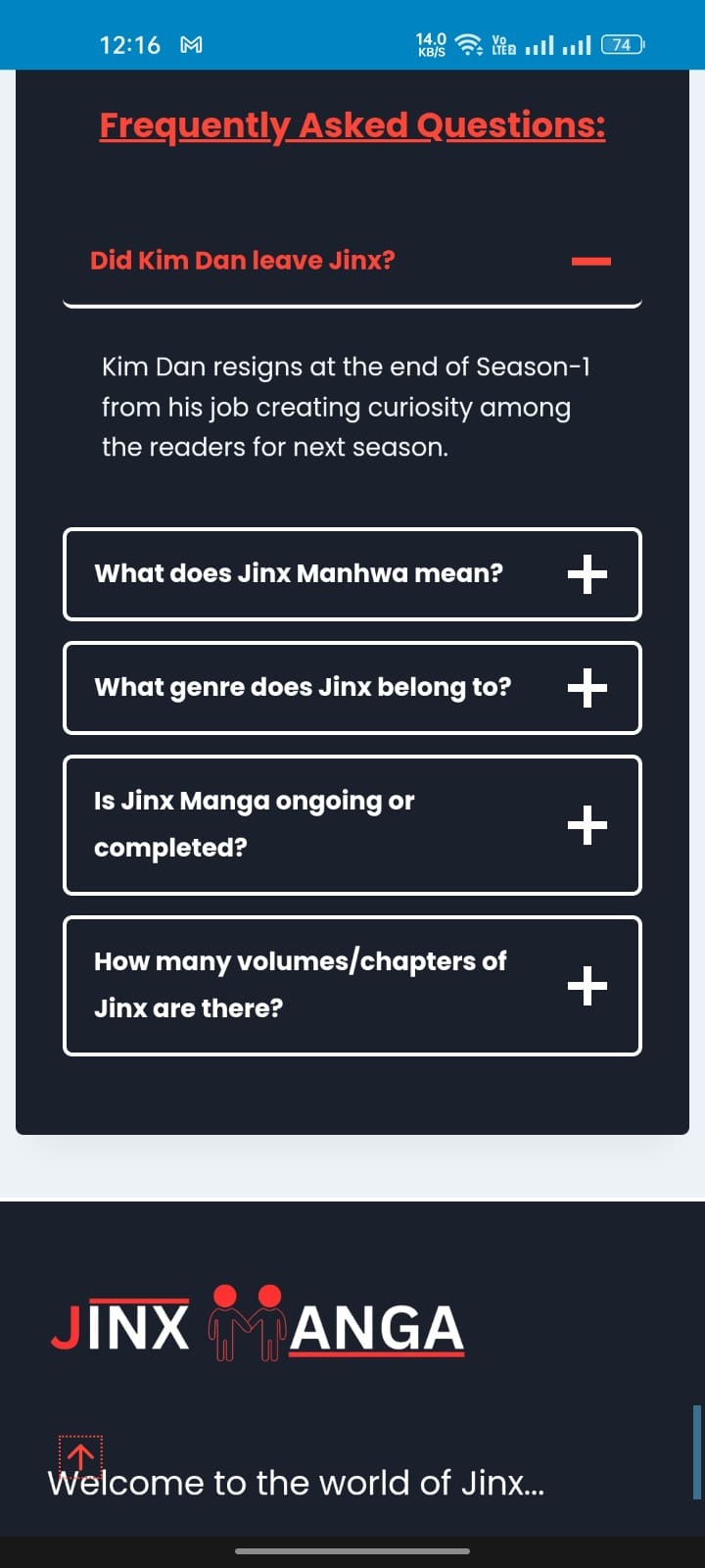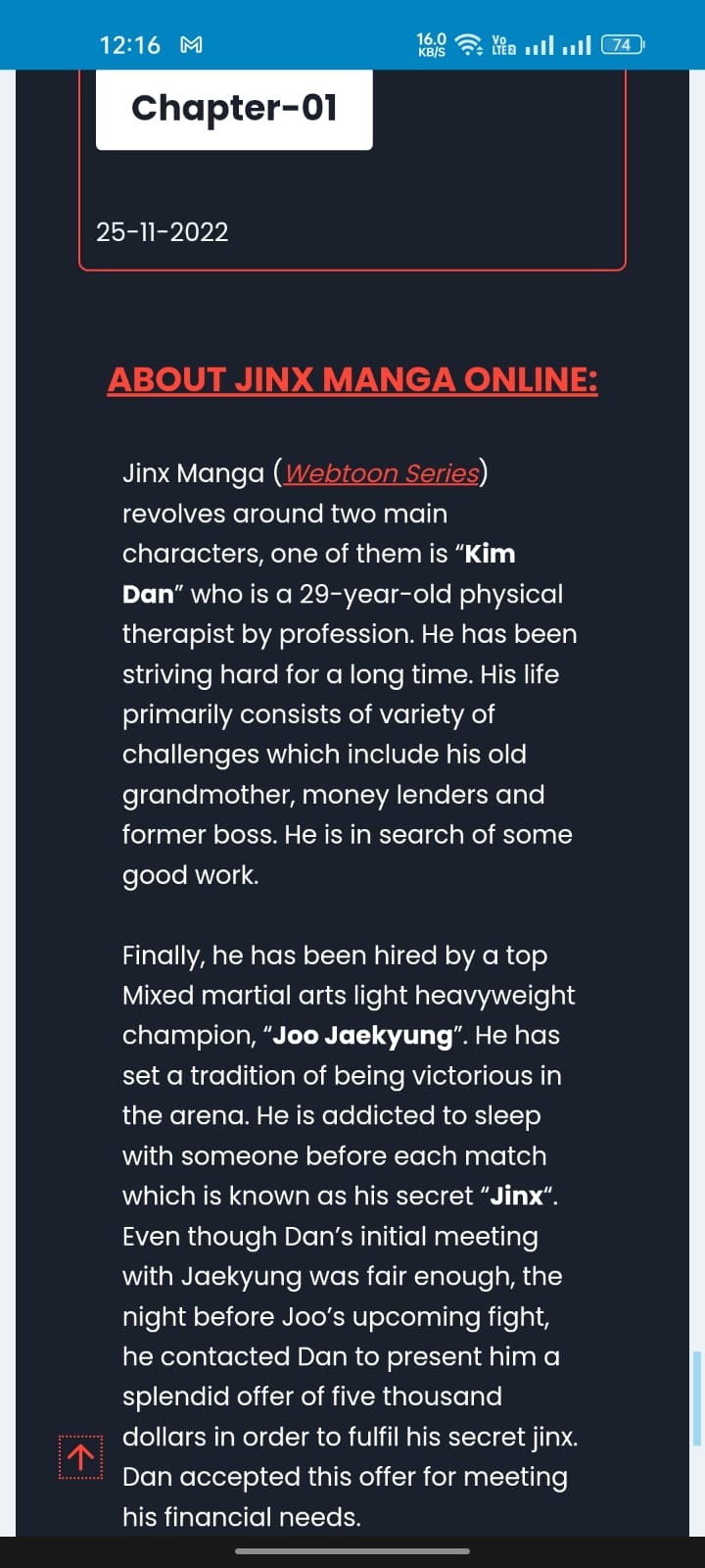 Jinx Manga (Webtoon Series) revolves around two main characters, one of them is “Kim Dan” who is a 29-year-old physical therapist by profession. He has been striving hard for a long time. His life primarily consists of variety of challenges which include his old grandmother, money lenders and former boss. He is in search of some good work.