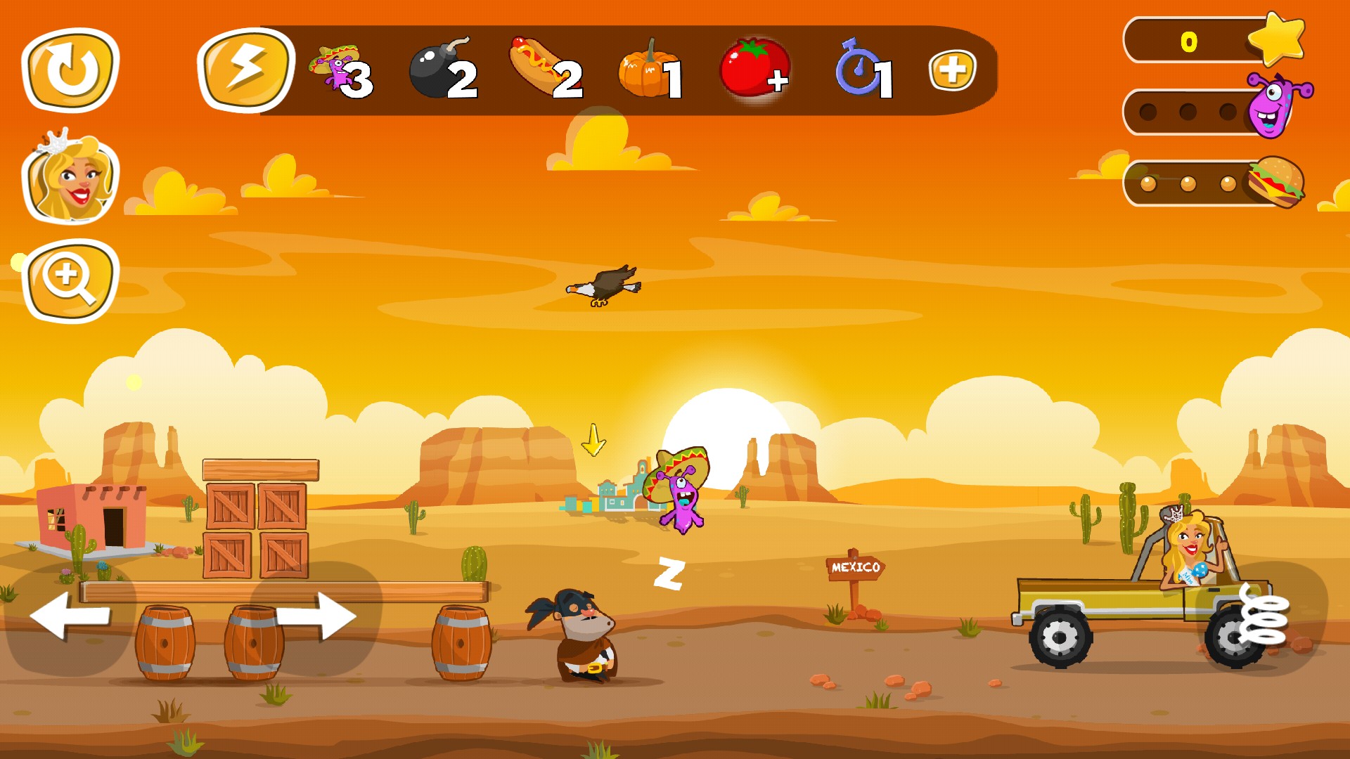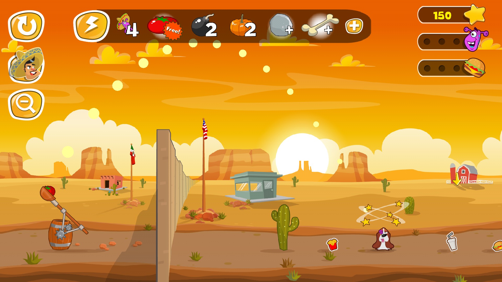 Pick your side (Mexico or USA), catapult the aliens to the other side of the Wall and control them to eat all food and then reach the escape vehicle. To help you overcoming the obstacles and opponents, you will be able to shoot a bunch of advanced weapons like pumpkins or hot-dogs and fight the nature, including wind, holes, rivers...
