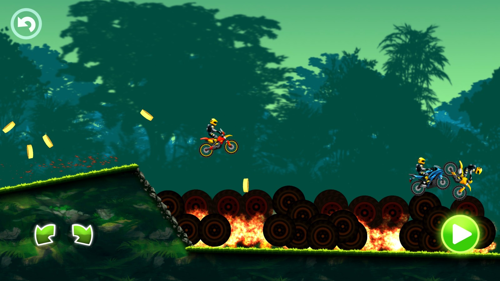 Are you ready to drive in a dangerous Jungle Motocross rally? If yes, then pick your favorite motorcycle from 4 given ones: The Hawk motorbike, Rush motorcycle, Green Devil and Chilli Devil motor rally cycles! Prepare for high speed race, compete with other motorcycle racers, jump through the burning ring of fire, do extreme stunts, dangerous backflips and frontflips and ride on an swampy mud track! If you are an adventure seeker, then this dangerous racing game is right for you! Jump on the motorbike and win the most dangerous jungle race!