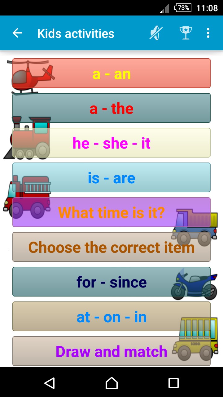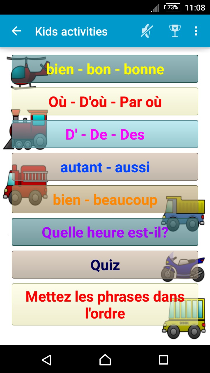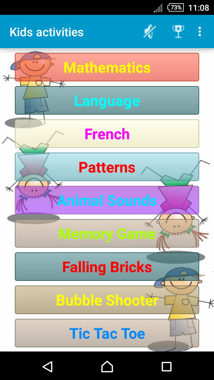 An entertaining application for children of preschool and primary school. Includes learning activities (counting, math, English and French language exercises) and fun (animal sounds, memory game, bird game).
