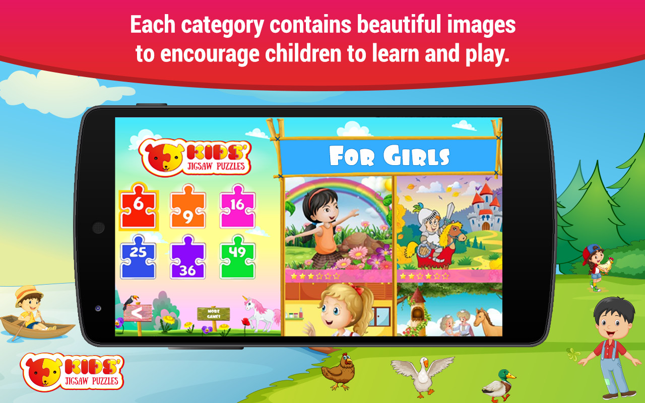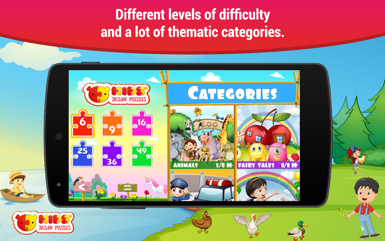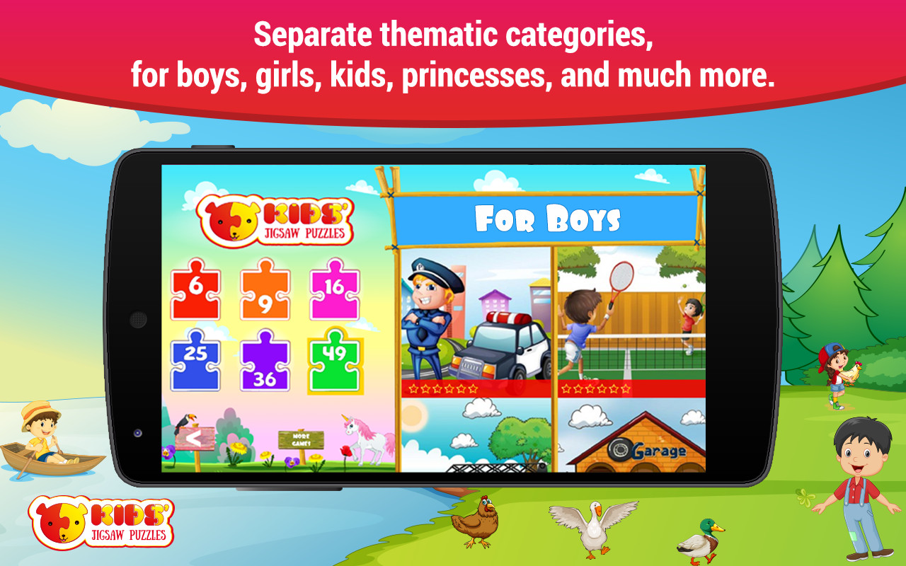 Kids’ Jigsaw Puzzles - free puzzle game for kids starting 3 years old. Jigsaw Puzzles for kids is wonderful game for girls and for boys, toddlers of any age, preschool, kindergarten and older children. We have created best jigsaw puzzle like game for kids as much realistic as it can be. If you’re looking for toddler matching games, here they are. Kids’ jigsaw puzzle game can be interesting, entertaining and can educate your children in creative way.