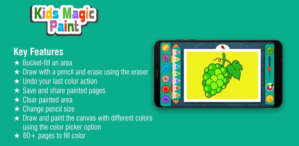 Kids Magic Paint is an application that helps your child express his/her imagination. There are a huge variety number of sketch drawings which are waiting to be painted. There are scenic drawings that include the skies and the mountains, the valleys and the rivers and the houses and almost everything you can imagine under the Sun. Also you would find the very cute rabbits, humped camels, innocent dogs, free-styled elephants and the wild and ferocious animals like the lion and the tiger and the bear and the cheetah. The child will make the tiger wear stripes and reserve the black coat for the elephant. And the skies and lakes have got to be blue!
