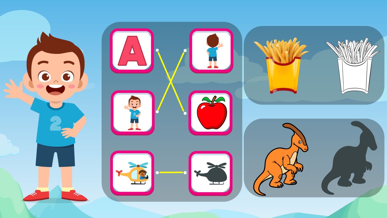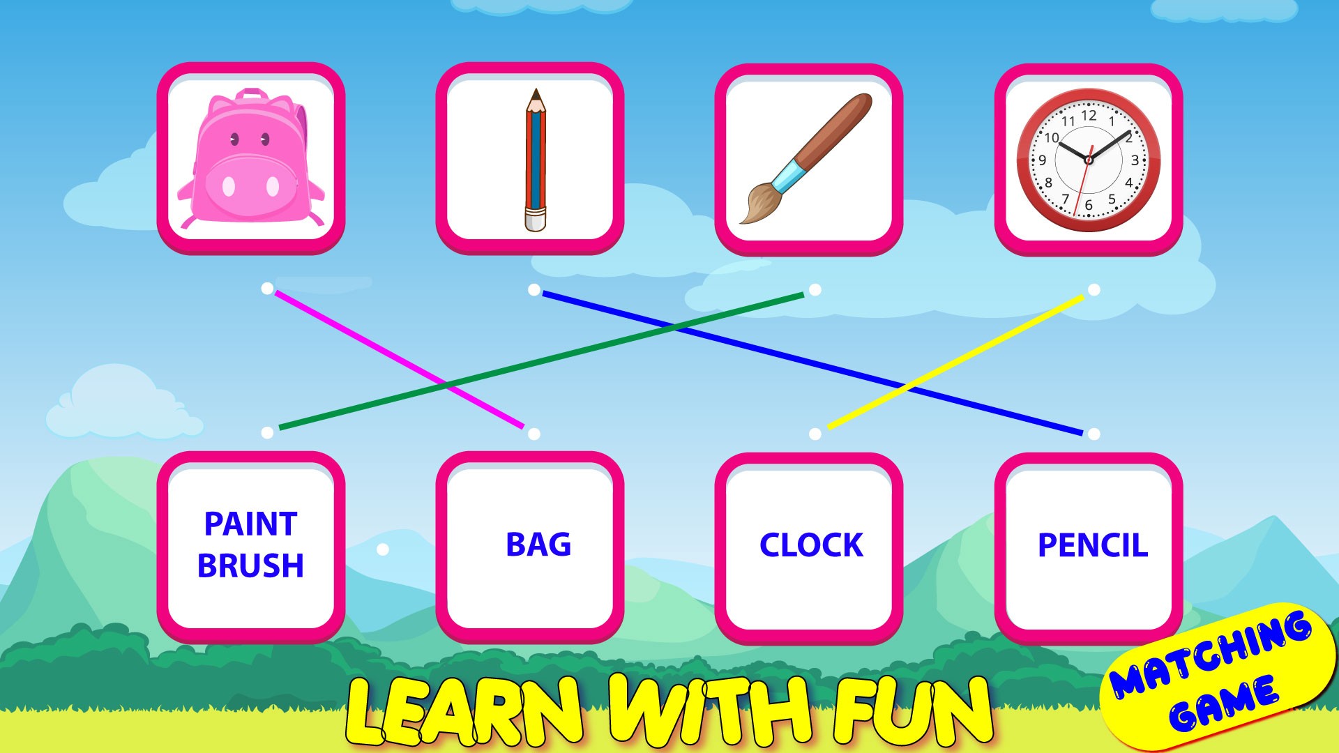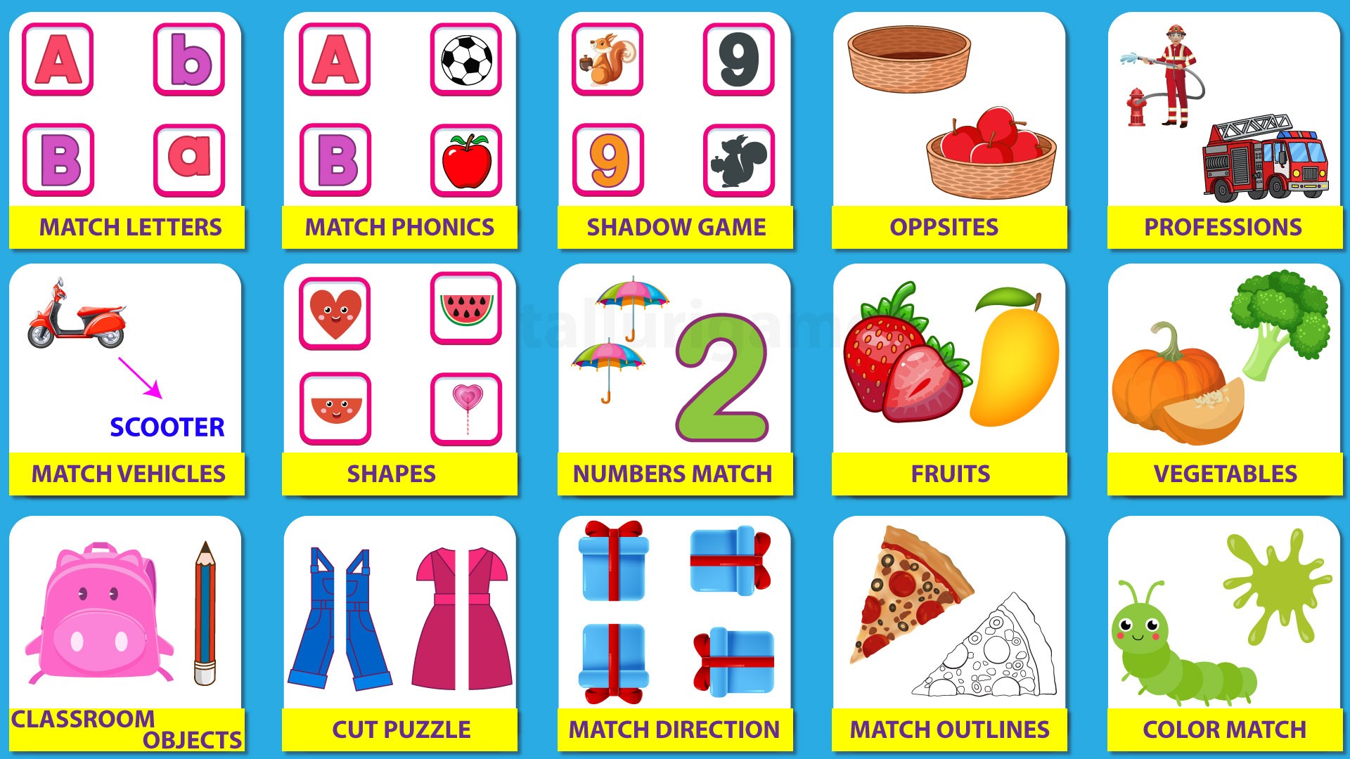 Matching game helps to learn, alphabet, phonics, learn numbers, learn shapes, colors, animals names, classroom objects, puzzles, drawings, fruits names, vegetables names, opposites, professions, directions, shadow match, vehicles names