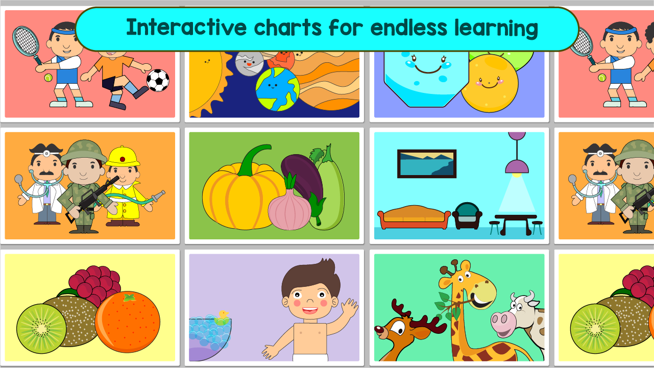 • So many attractive and interactive charts for learning Vegetables, Fruits, Sports, Professions, Animals, Numbers, Solar System, Planet and stars.