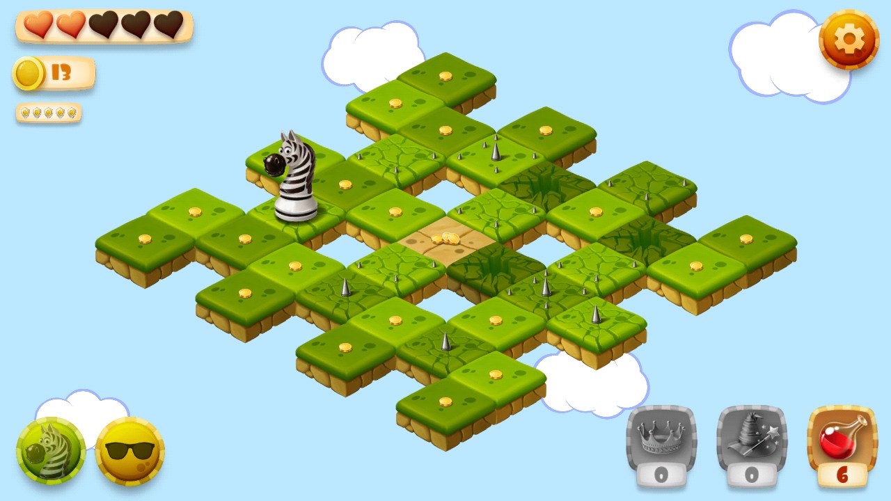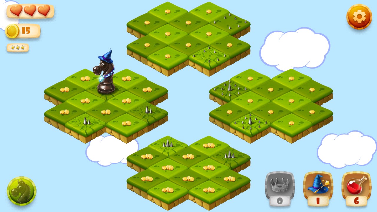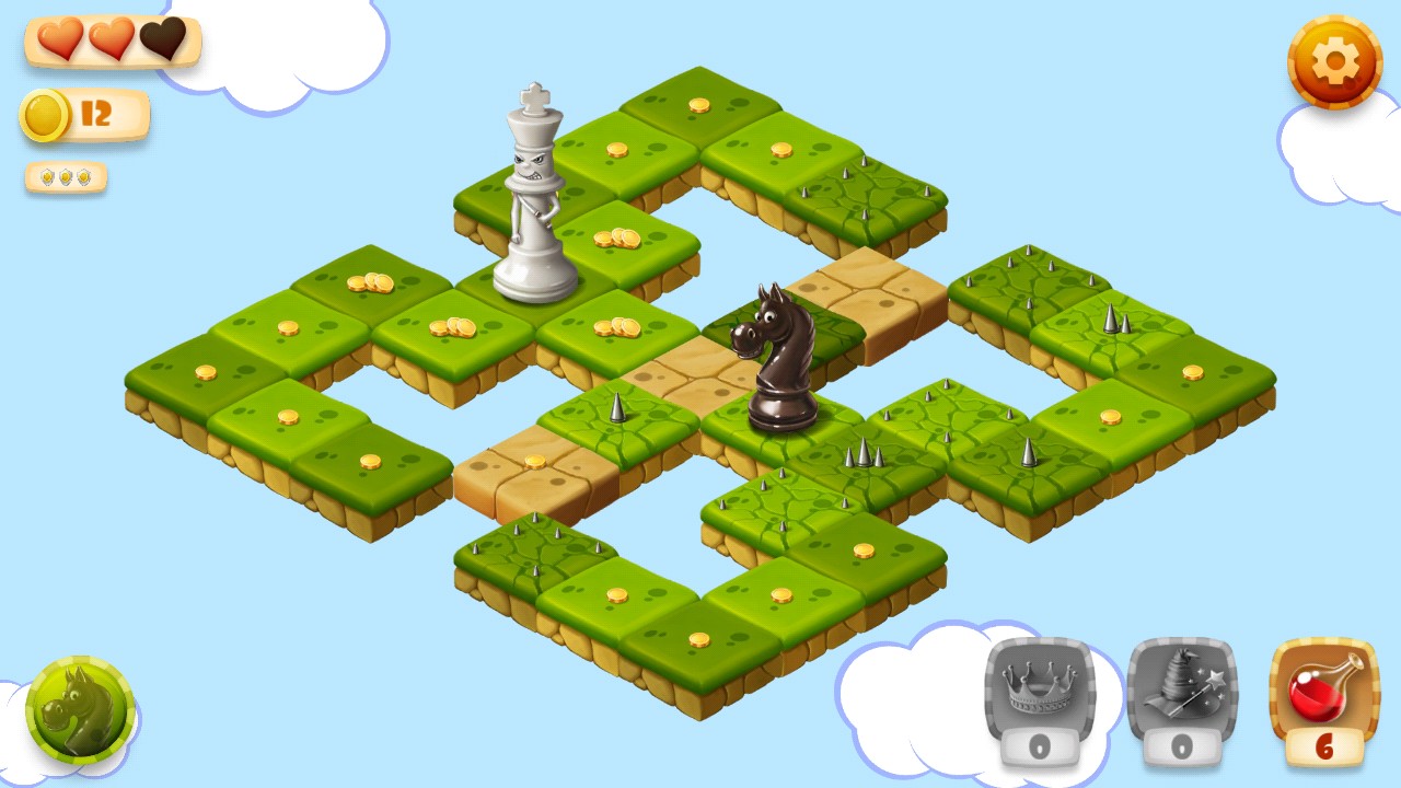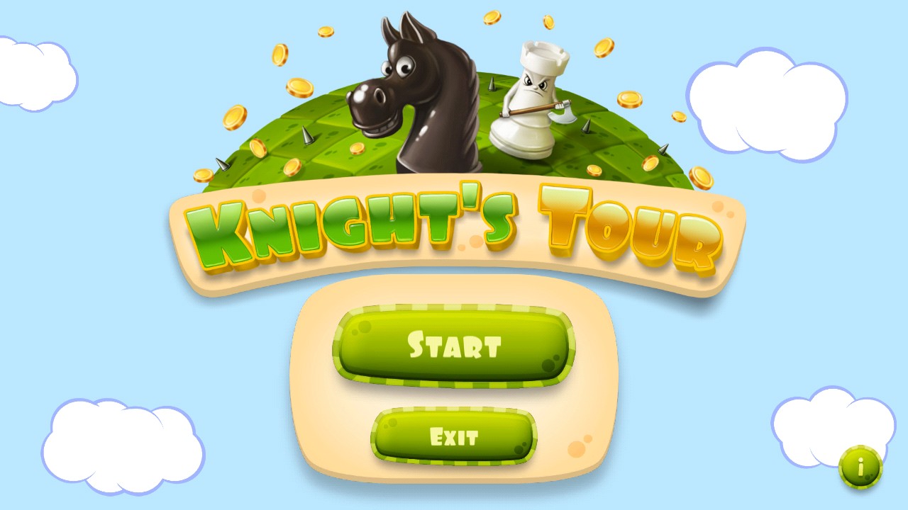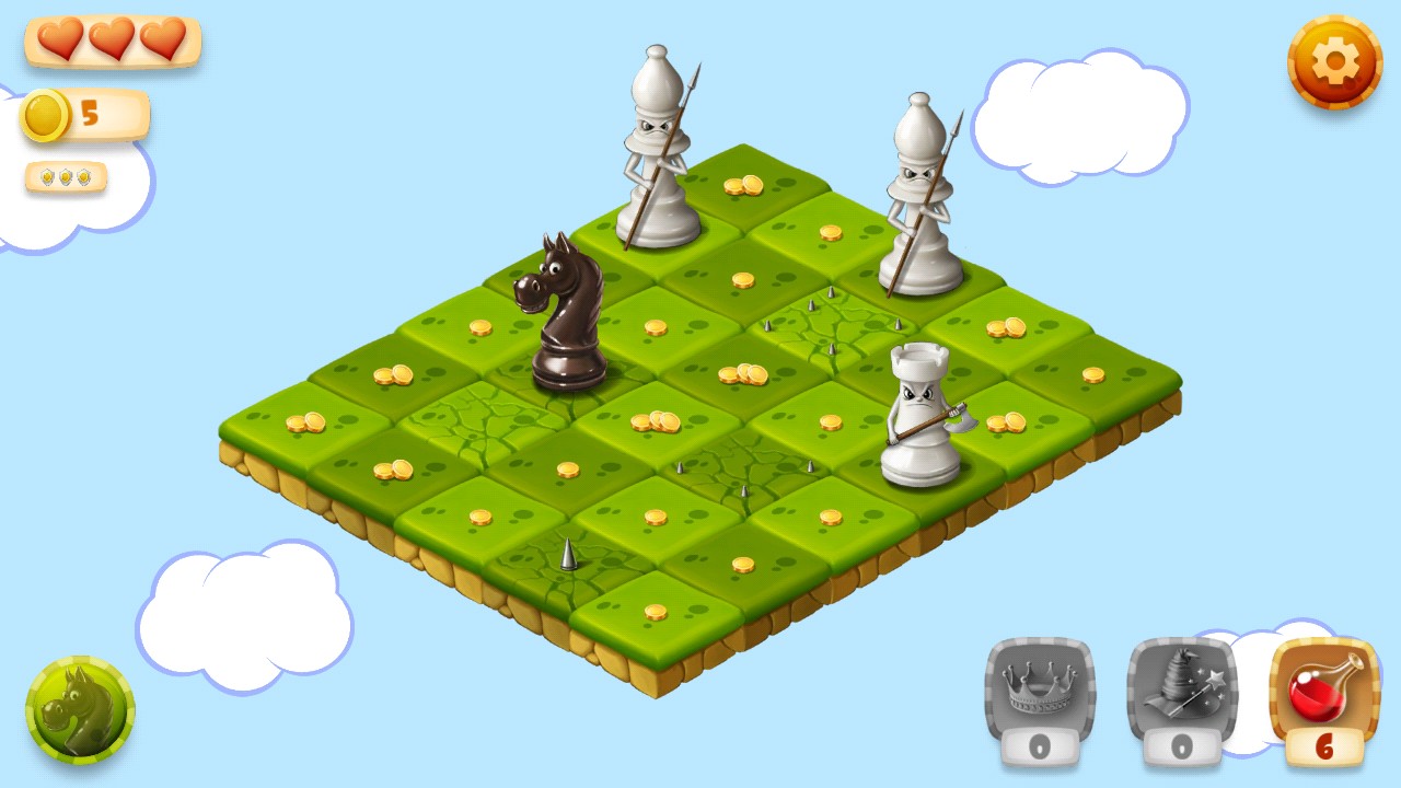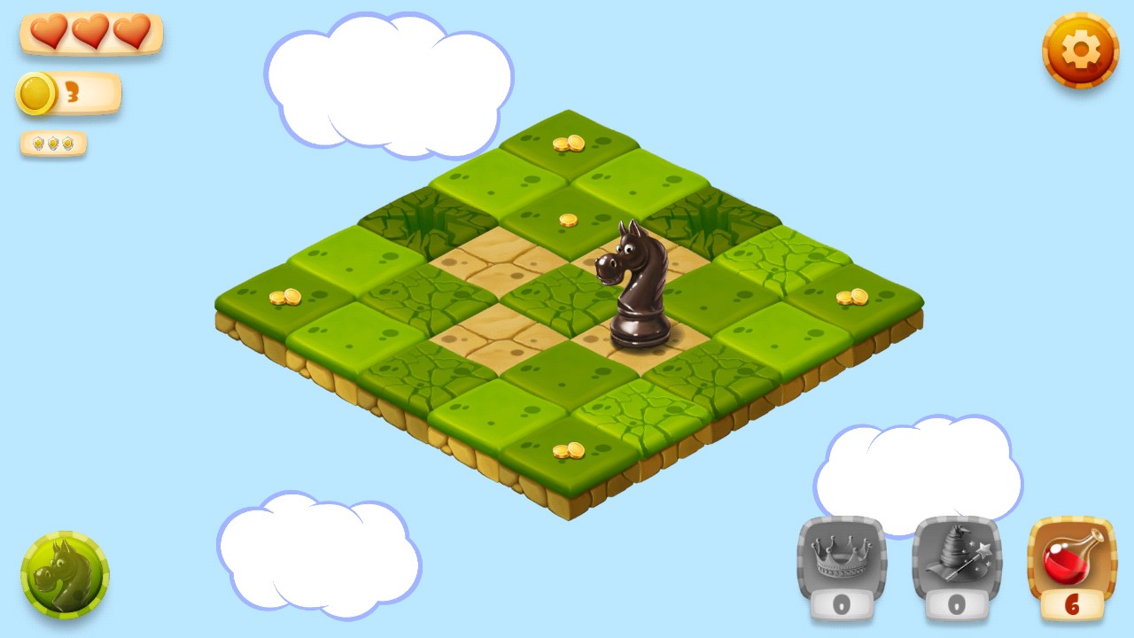 Knight's Tour is a variation on a classic puzzle that involves moving a knight around a chessboard. It's an exciting game in which you collect coins by moving in an "L" shape. You'll have to think well to avoid getting stuck and dying. You will face multiple challenges on your way, and coins may be guarded by enemies. You will fight chess pieces - king, rook and bishop. The coins you collect will help you improve your horse or unlock a new one. "Queen", "Wizard" and "Health Bottle" bonuses will facilitate you walking through the gameplay.