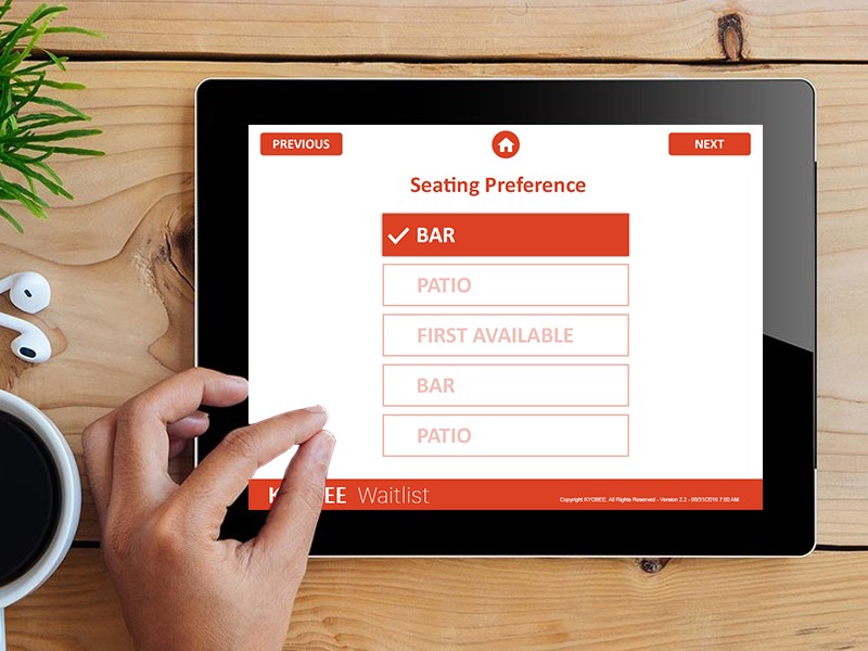 Simply touch the screen to sign-in your name, your cell phone number or email (for notifications) and the number of people in your party. Then select your seating preference and add yourself to the KYOBEE WAITLIST.