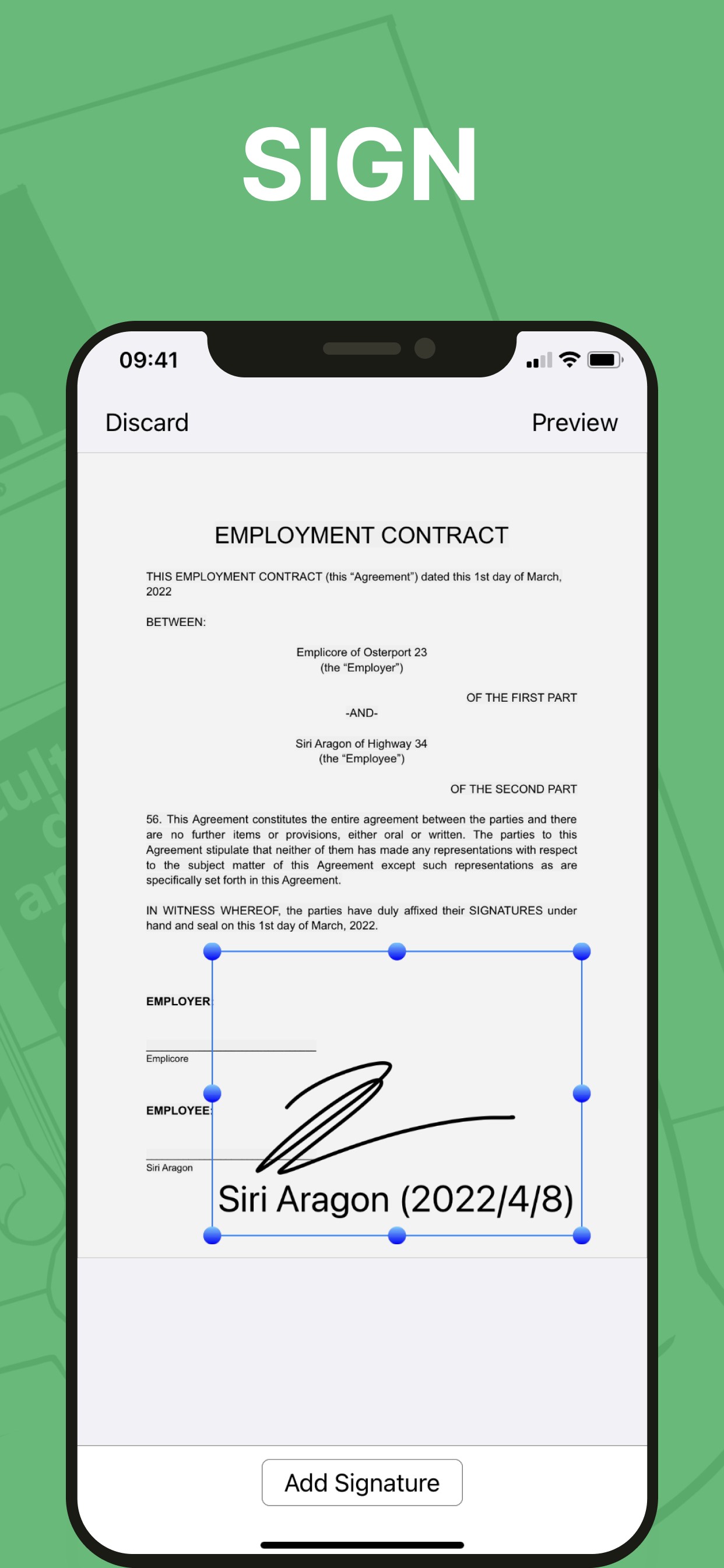 You can rotate a document to the right position. You can put filters to your documents or images to create different effects. You can sign on the image or PDF with your hand drawing signature and then save the signed document. You can add new text to the files.