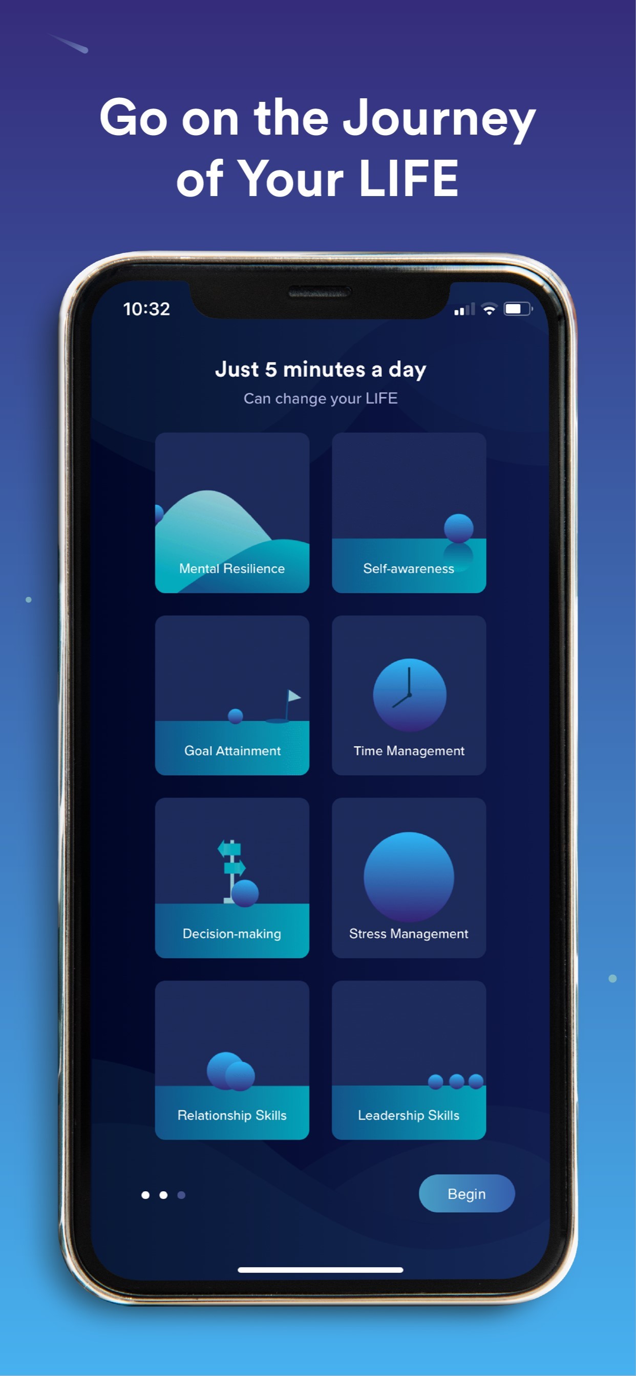 Mental health, work productivity, and relationships are inextricably linked. While most apps only address one silo, LIFE covers it all. Each morning, we send you a 5-minute lesson. Grow in 9 core areas, curated with thoughtful flow: