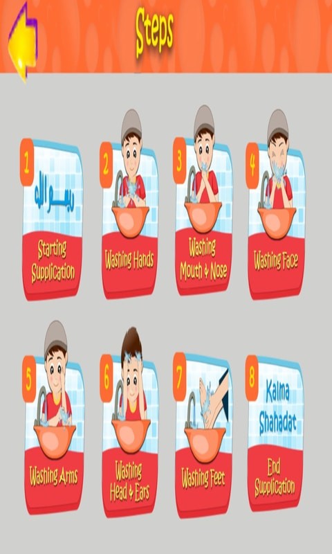 This part of Islamic learning section is for teaching kids wudu. This section contains Wudu steps with illustrations for the kids to easily understand and learn the Islamic way to perform Wudu.
