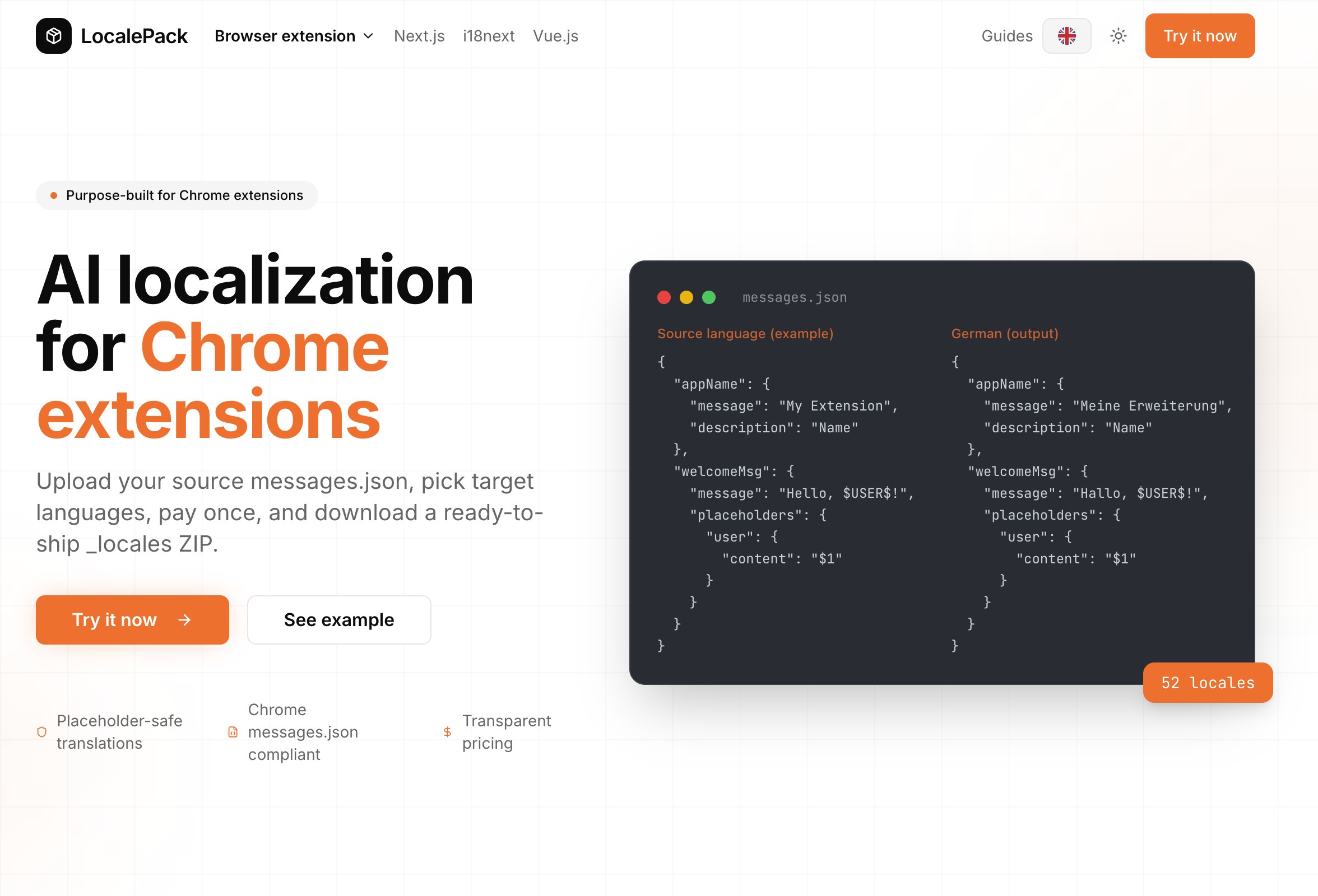 LocalePack translates browser extension messages.json, i18next, vue-i18n, and Next.js locale files into up to 52 languages and packages them in a ready-to-submit ZIP. Placeholders and plural keys are preserved. Pay once via Stripe.