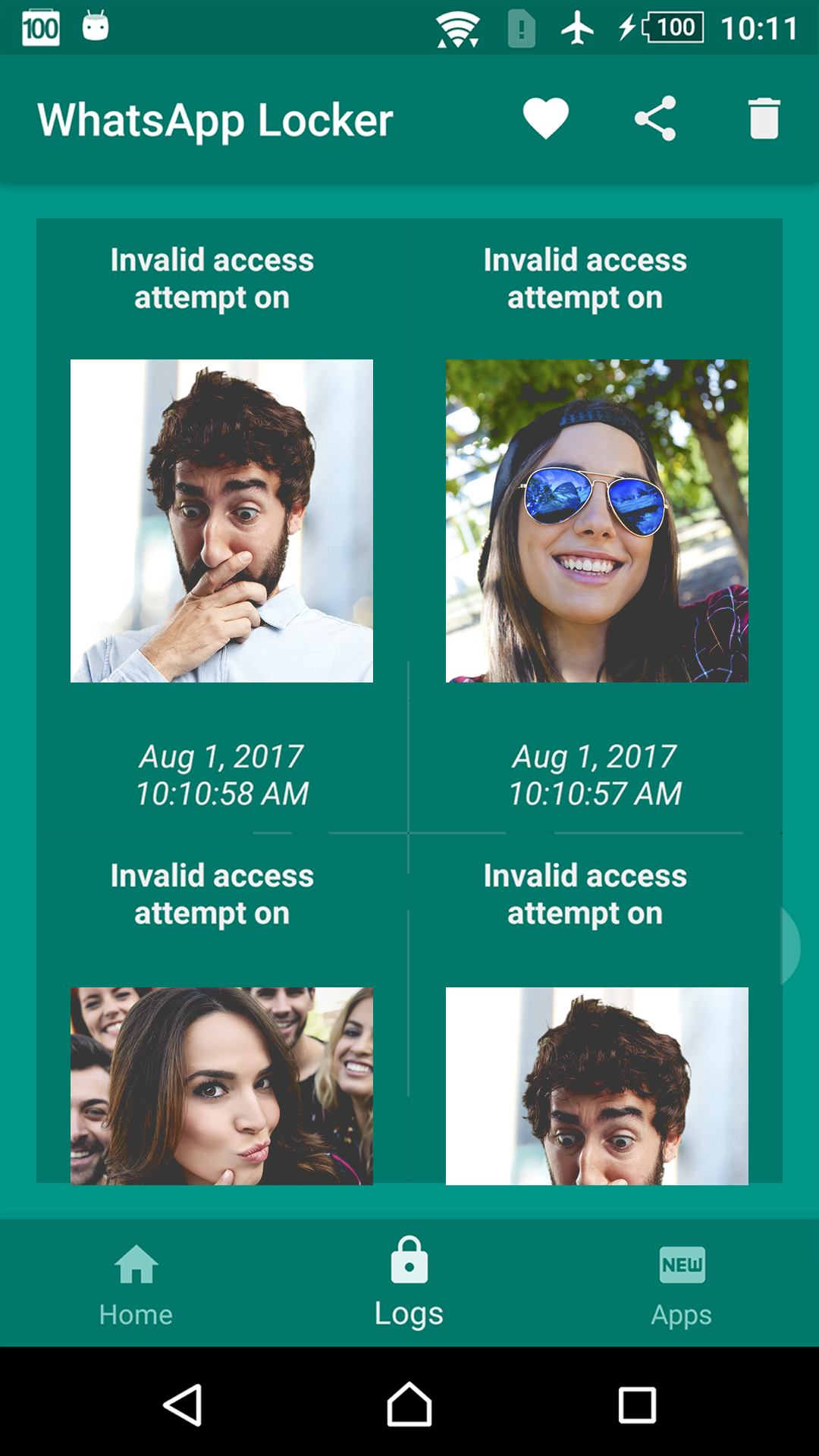 Capturing intruders when trying to access WhatsApp is only available for devices with a front camera. If you enter a wrong pin or pattern, a small, visible image will be generated within the logs section of the lock for WhatsApp application; Camera and storage access is only used in case of activating the Image capture option of failed access attempts to WhatsApp