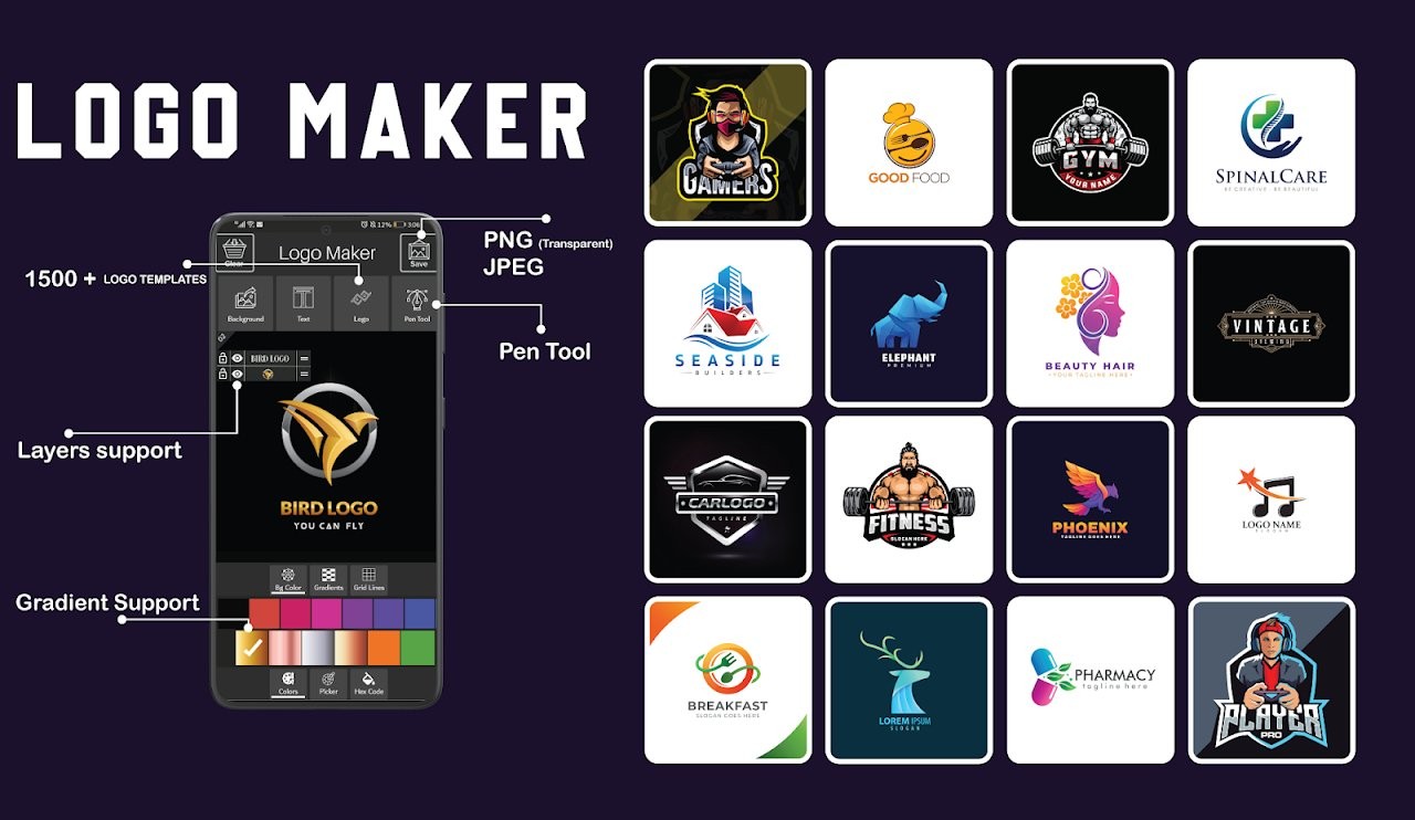 Logo maker free is a fully loaded logo creator app for graphic design free. Now design logos for gaming, business, esports and company events with logo editor using premium shapes, symbols, icons, typography and logo templates in 3d. Start designing your logo for your gaming squad using gaming logo maker to represent your clan or gaming team with a professional yet powerful logo in esports or give your brand a unique identity using logo maker app for free.