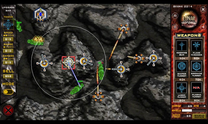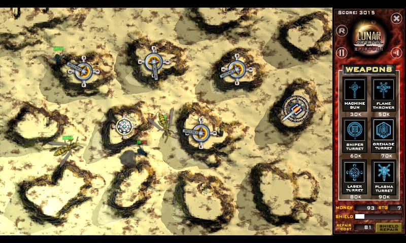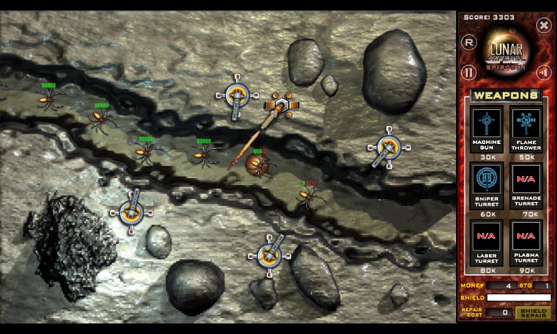 The main purpose of the game is to defend our routes and bases against waves of giant insects. In order to do it and advance to the next stage, you must build turret defenses in strategic places of the scenario. Each enemies that reaches the other side of the screen or touches our bases without been killed by your defenses causes damage to the shield that is represented by a white bar in inferior part of the side bar, in the right side of the screen. When this shield is depleted the game is over. Each enemy killed by your defenses worth a small amount of money. Use this money to build new towers, to upgrade the existing ones or to repair the shield.