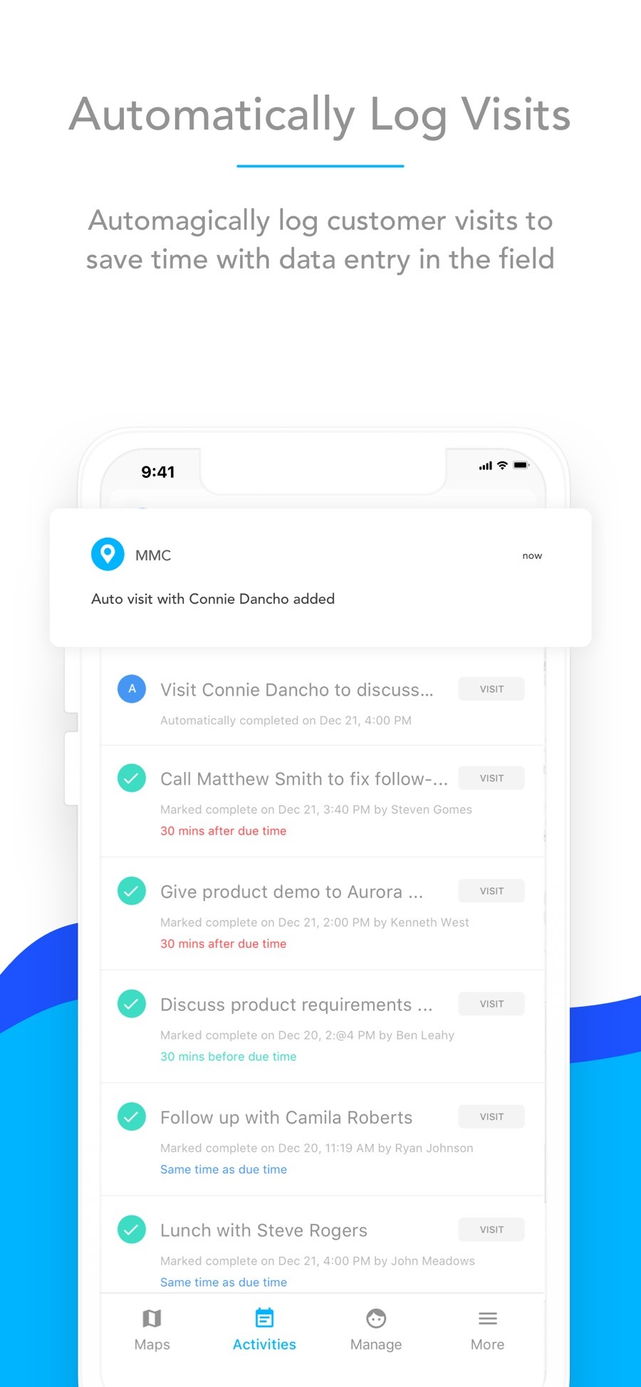 - Easily keep tabs on customers by getting automatic reminders when they need visiting