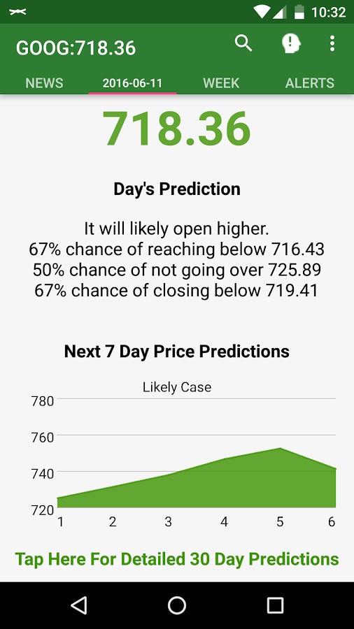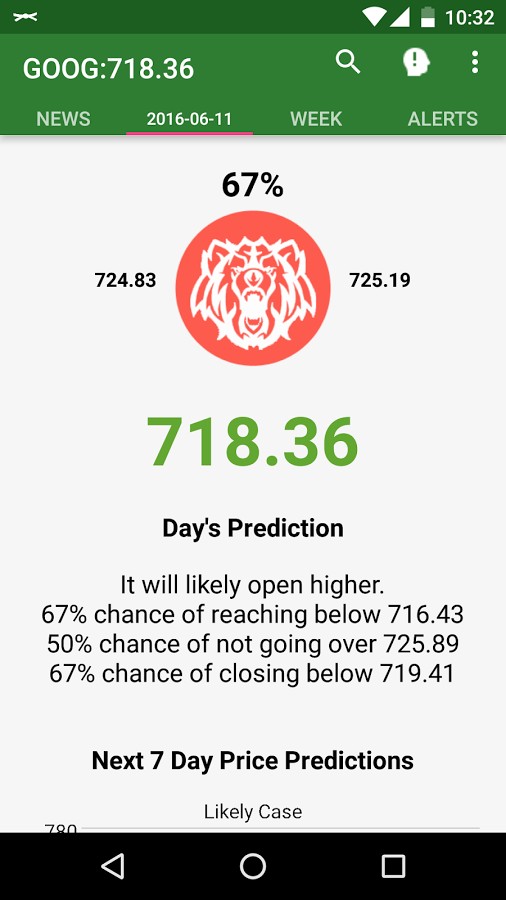 Market Sensei gives a stock's most likely low, high, opening & closing prices - daily. So you are comfortable in making your investment and trading decisions. Sensei also improves your intuition with the most fun stock training game. You can also explore the activity of interesting stocks in a more fun way. View stock predictions for each of the next 7 trading days.