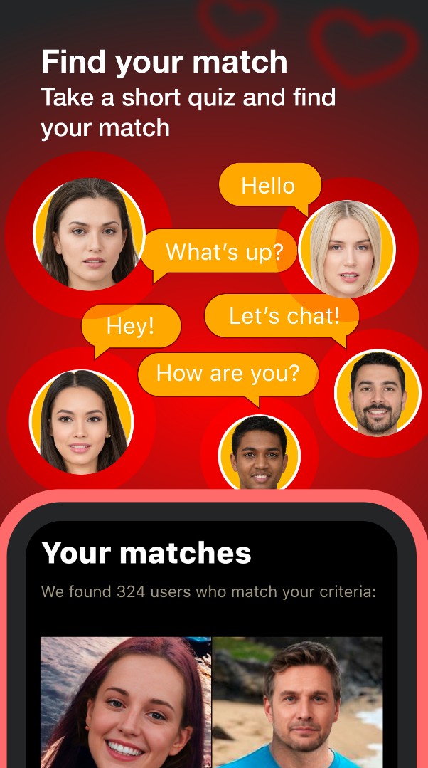 Take a short psychological test and find out your best match. Find attractive people close to you who share the same interests, and get to know them before meeting in real life. Our free dating app will help you communicate without boundaries and find the right match online. Join thousands of single people looking for a real relationship.