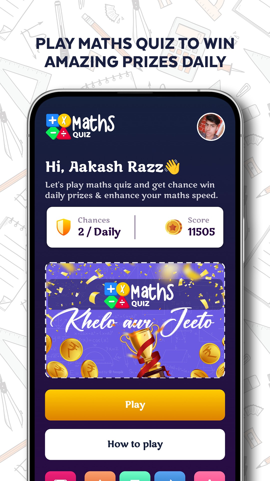 Maths Quiz - Khelo Aur Jeeto is a free quiz app designed to enhance your mathematical skills through addition, subtraction, multiplication, and division questions & win amazing prizes daily. This app offers a user-friendly interface with colorful visuals, allowing you to track your score while providing 10 daily questions. You'll have 4 options to choose the correct answer, making it both challenging and educational.