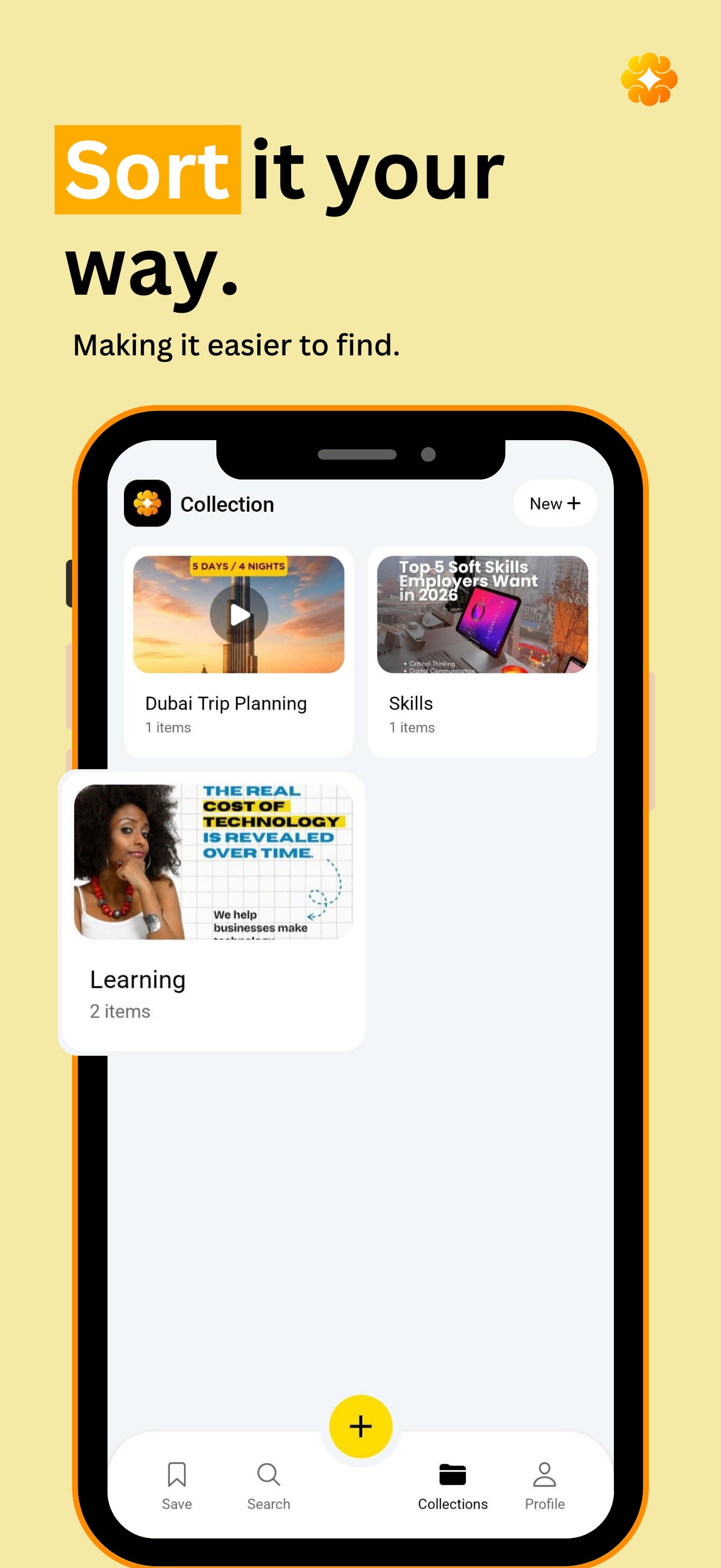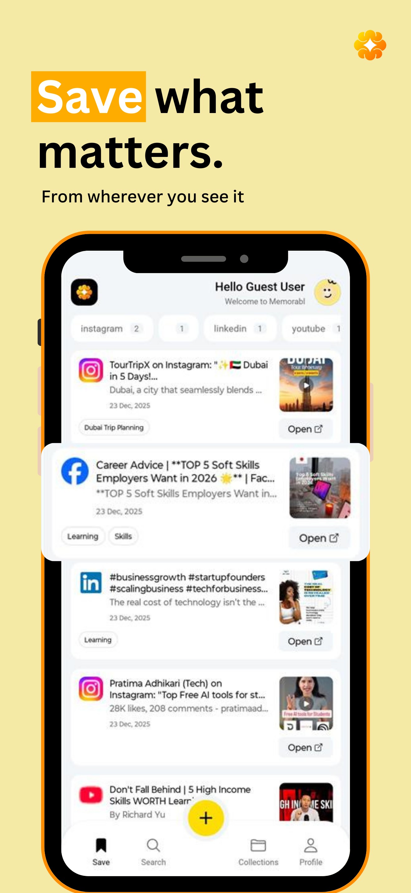Websites, posts, reels, videos, articles. Every link you save, instantly searchable in one place. Because searching in one place is easier than organizing or remembering.