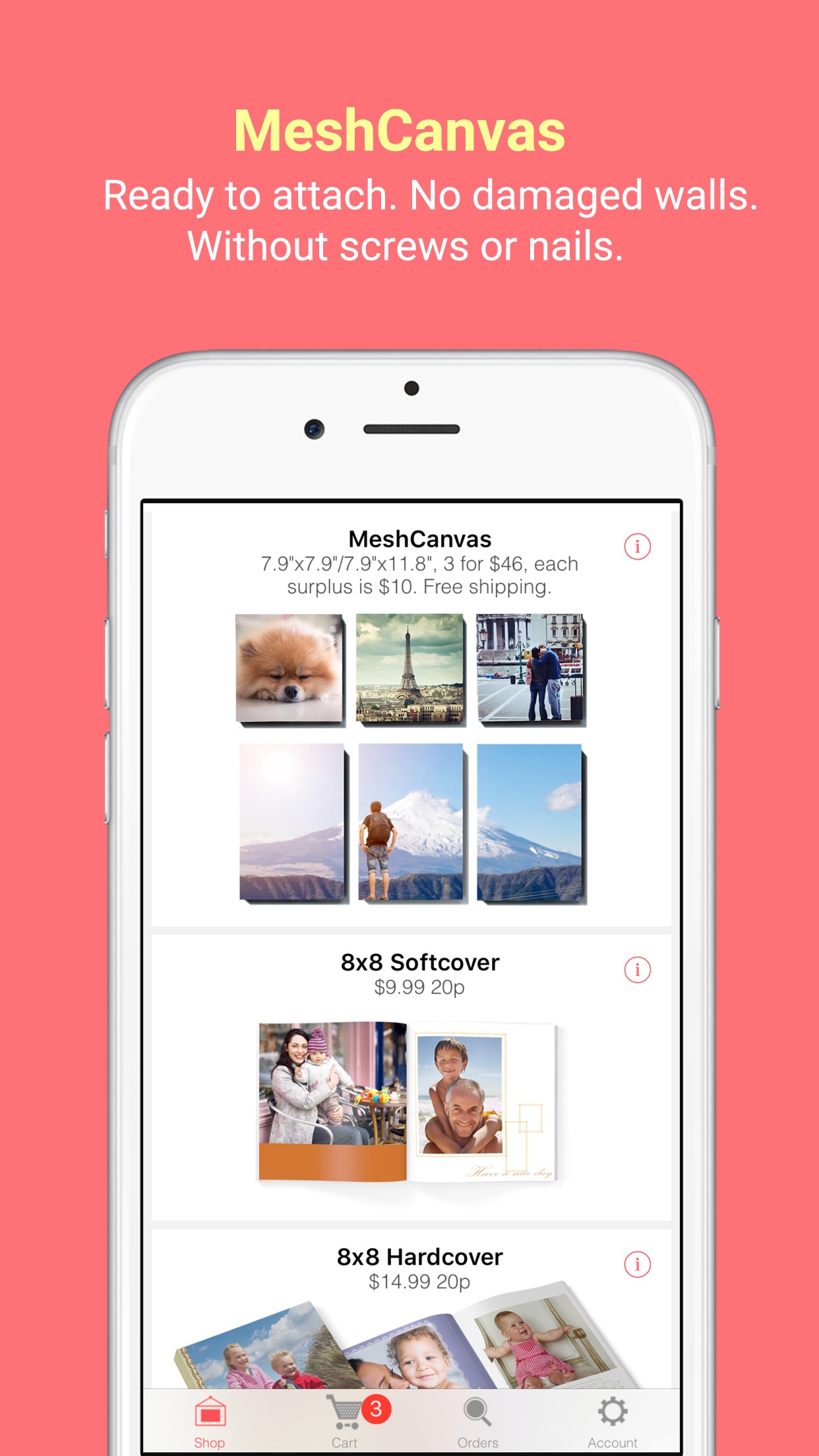 MeshCanvas comes in two shapes: square (8" x 8" x 0.75") and rectangle (8" x 12" x 0.75"). You can mix photo tiles on your walls. Make a collage by your photos.