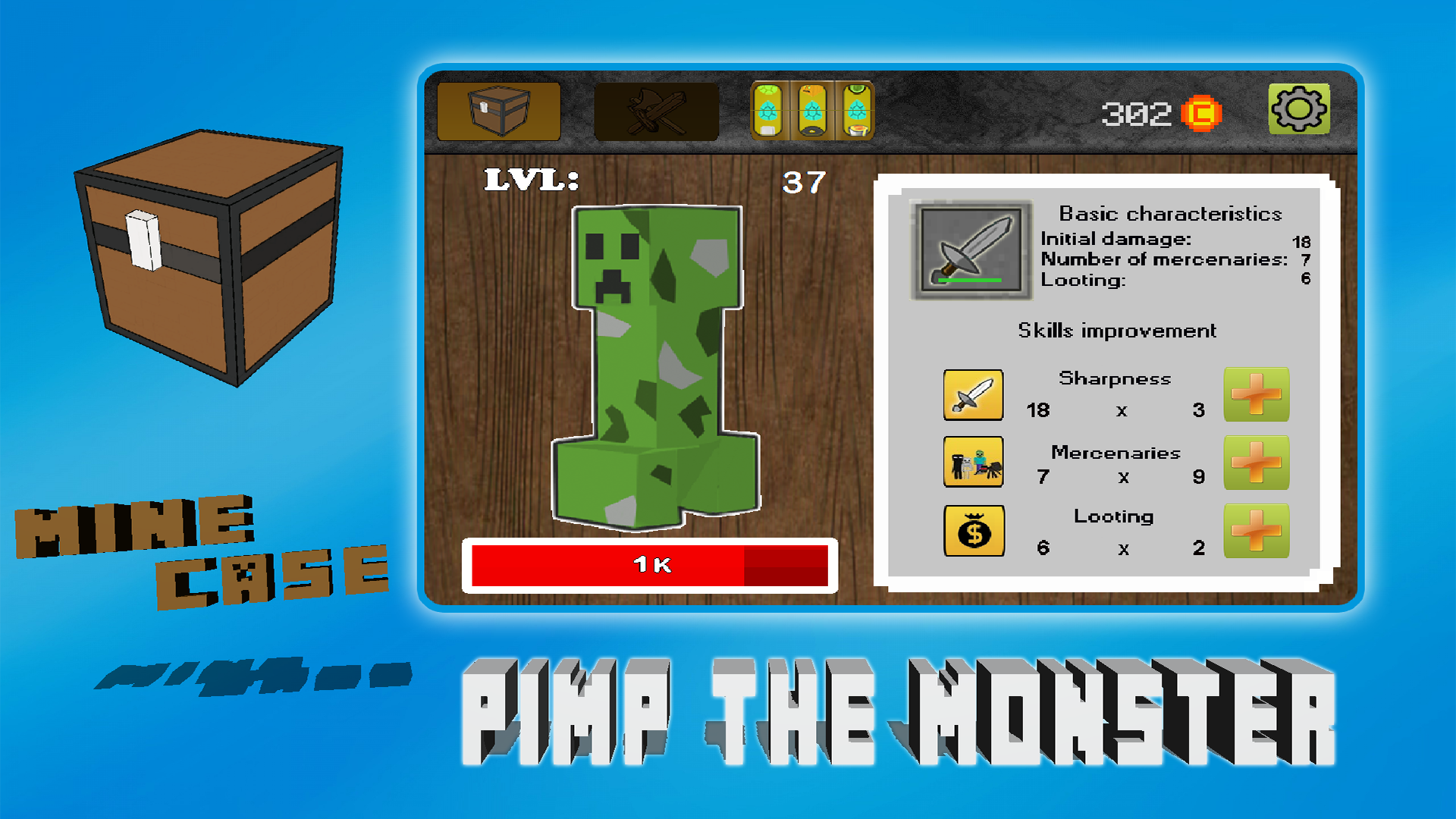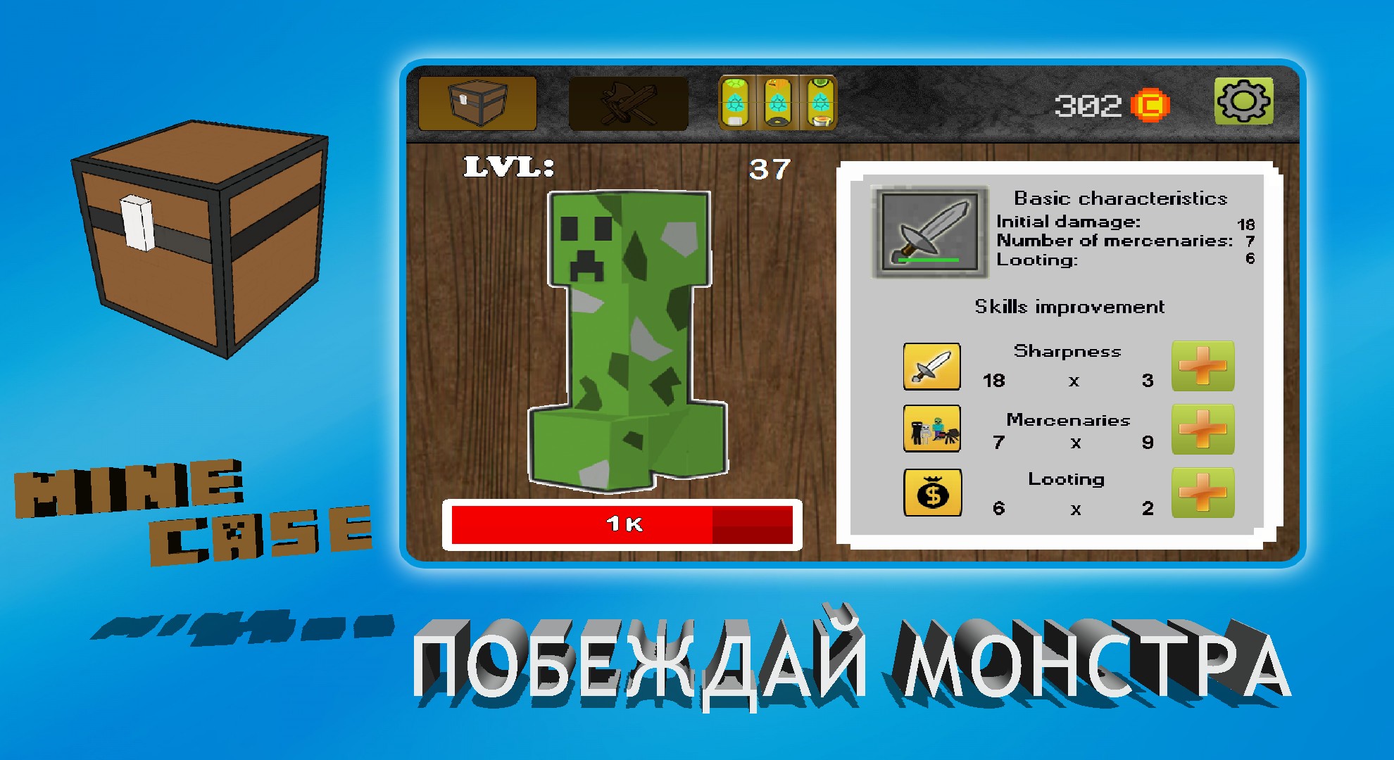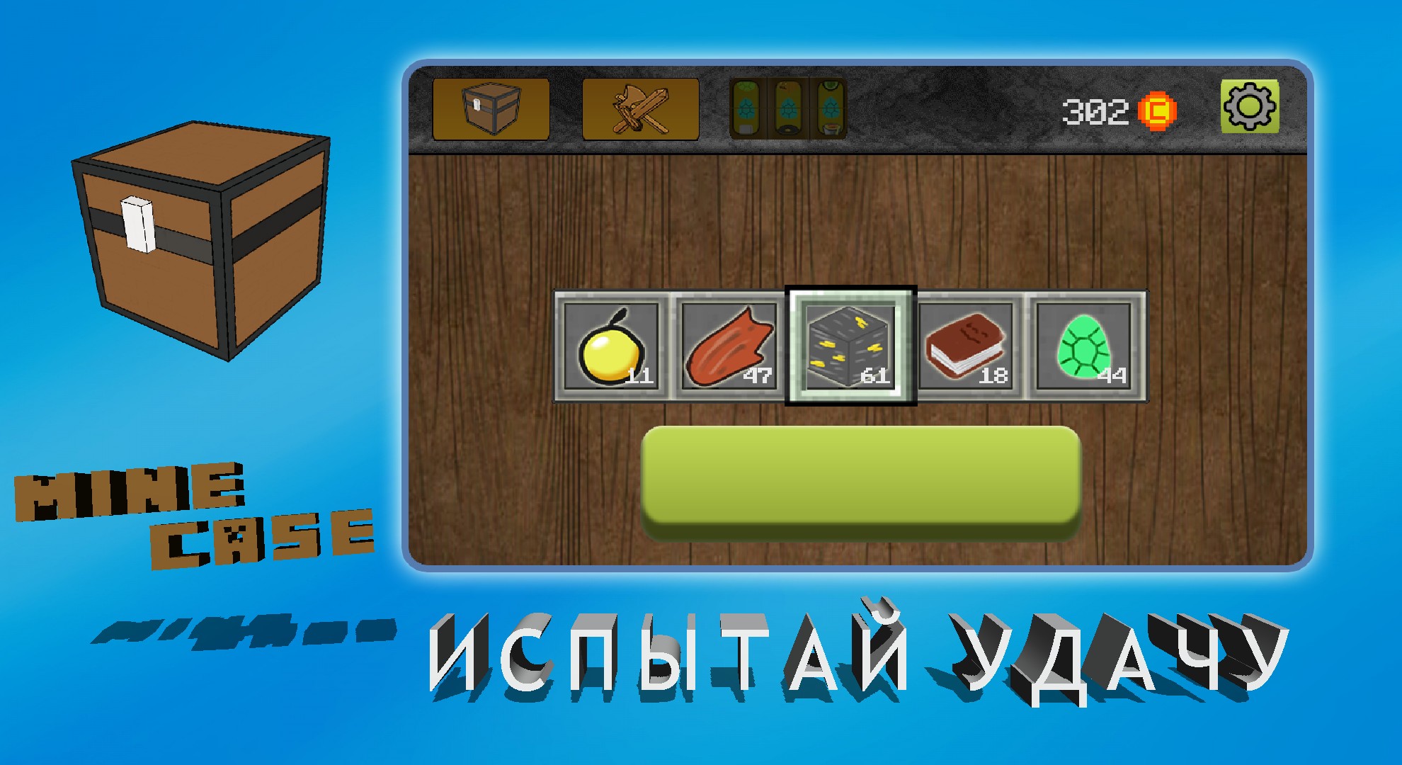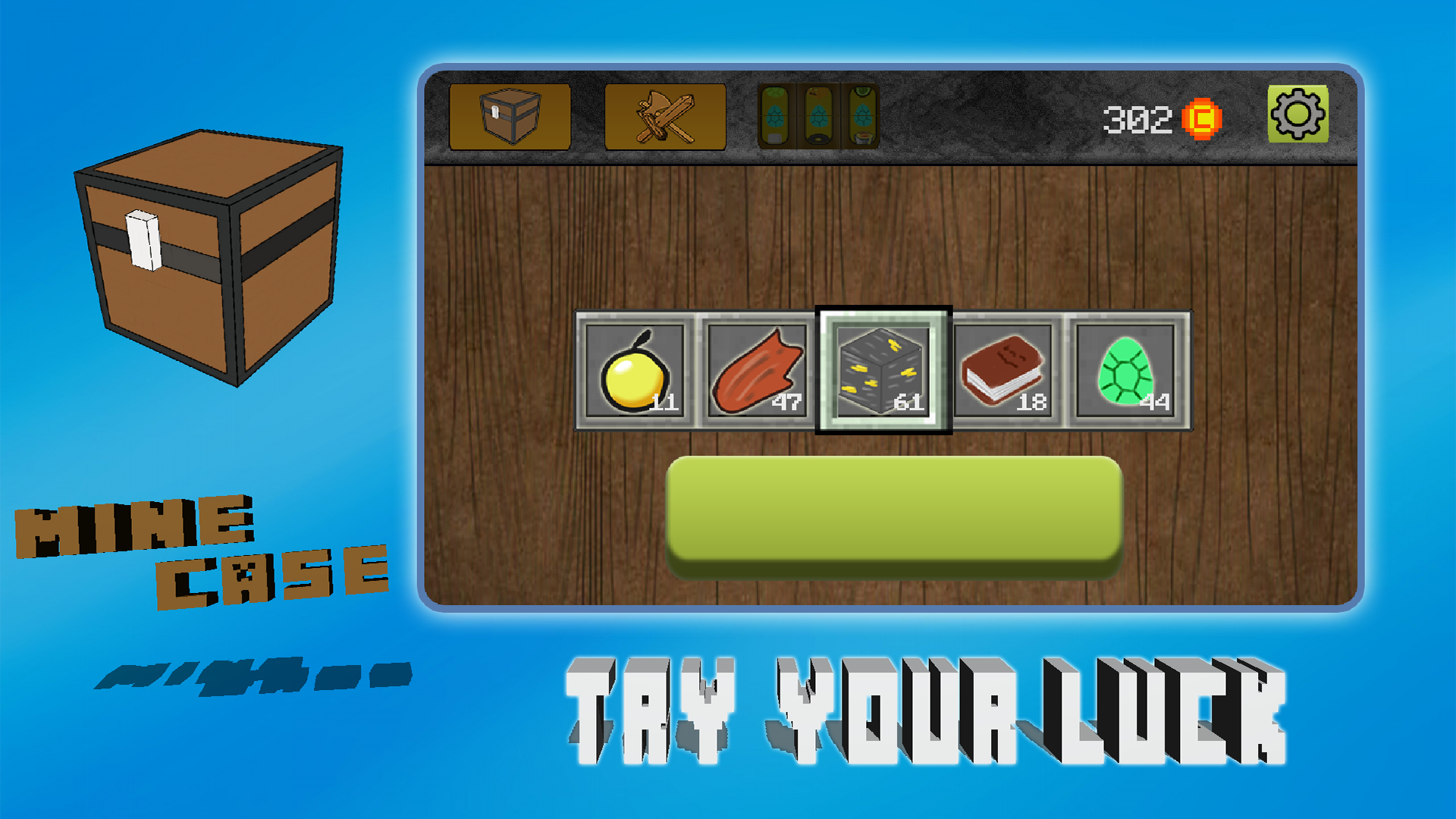 Minecase-game, which will connect you to the world of the miners. You get a unique opportunity to try their luck in the world of the miners. Try to get the rarest items knocking them out of the roulette. In your inventory may be the most interesting objects: tools, resources, power, swords, diamonds, gold, silver, unique pieces. Try to defeat the evil monster, Suck my skills and knock out the things that will help you in battle with a strong monster.Compete with your friends and prove to everyone that you have a most valuable inventory and the biggest monster.In the near future will be the creation of objects.