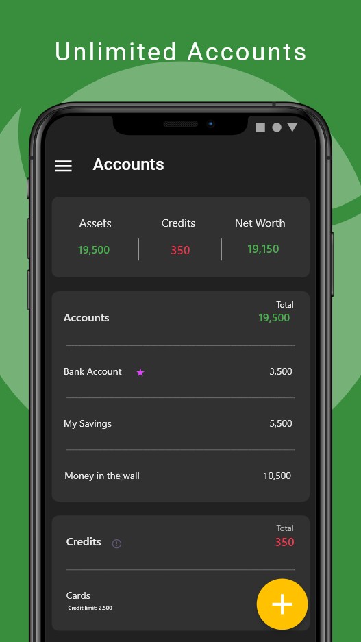 - Unlimited Accounts, with different types (Checking, Savings, Credits etc.).