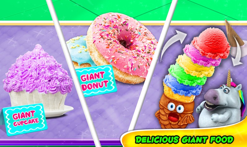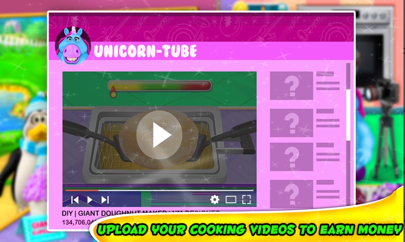 Help the fat unicorn be the video blogger & streamer. But there are so many other video bloggers on the internet so he decided to make something new and out of the box. So he decided to make the traditional desserts in GIANT size treats. His idea is amazing so make him publish his GIANT food videos on famous video blogging sites. Make him earn a lot of video views and subscribers so he may get rich quick! Also help him sell the giant food to his clients and serve them their favorite desserts in a giant size for some added fun. Help him being the best Giant food chef cook and video blogger Make Giant Cupcakes, Giant Donuts and Giant Ice cream cones as fast as you can , make the videos of your cooking and publish them to earn some extra money. Be the real streamer chef and create your amazing cooking master pieces.