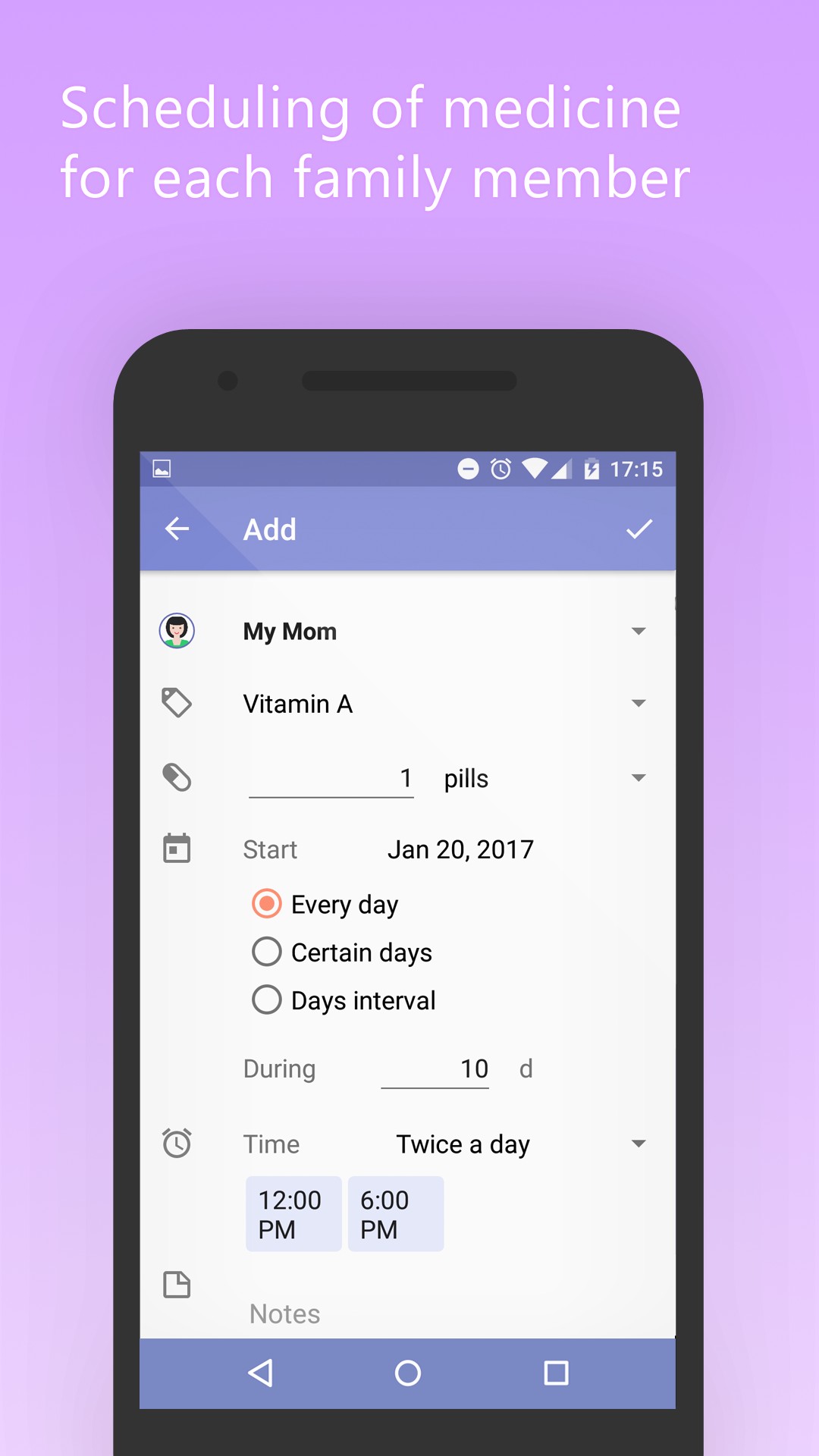 - Setting periodicity of the medication in days and the app will schedule it only on the right dates.