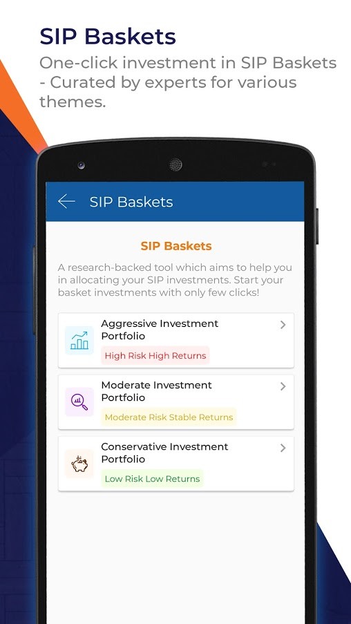 This easy-to-use mutual funds app is fast, intuitive, simple, and provides features like free mutual funds account opening. The process is entirely paperless. You can choose from Equity oriented, Debt oriented & Hybrid(Balanced) Mutual Funds​ or invest in Equity Linked Saving Schemes (ELSS) i.e. Tax Saving Mutual Funds​.