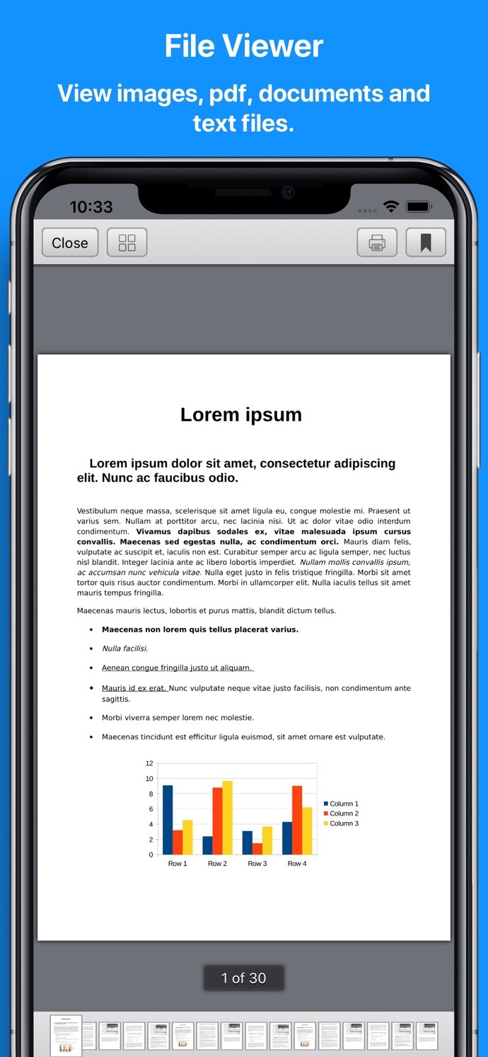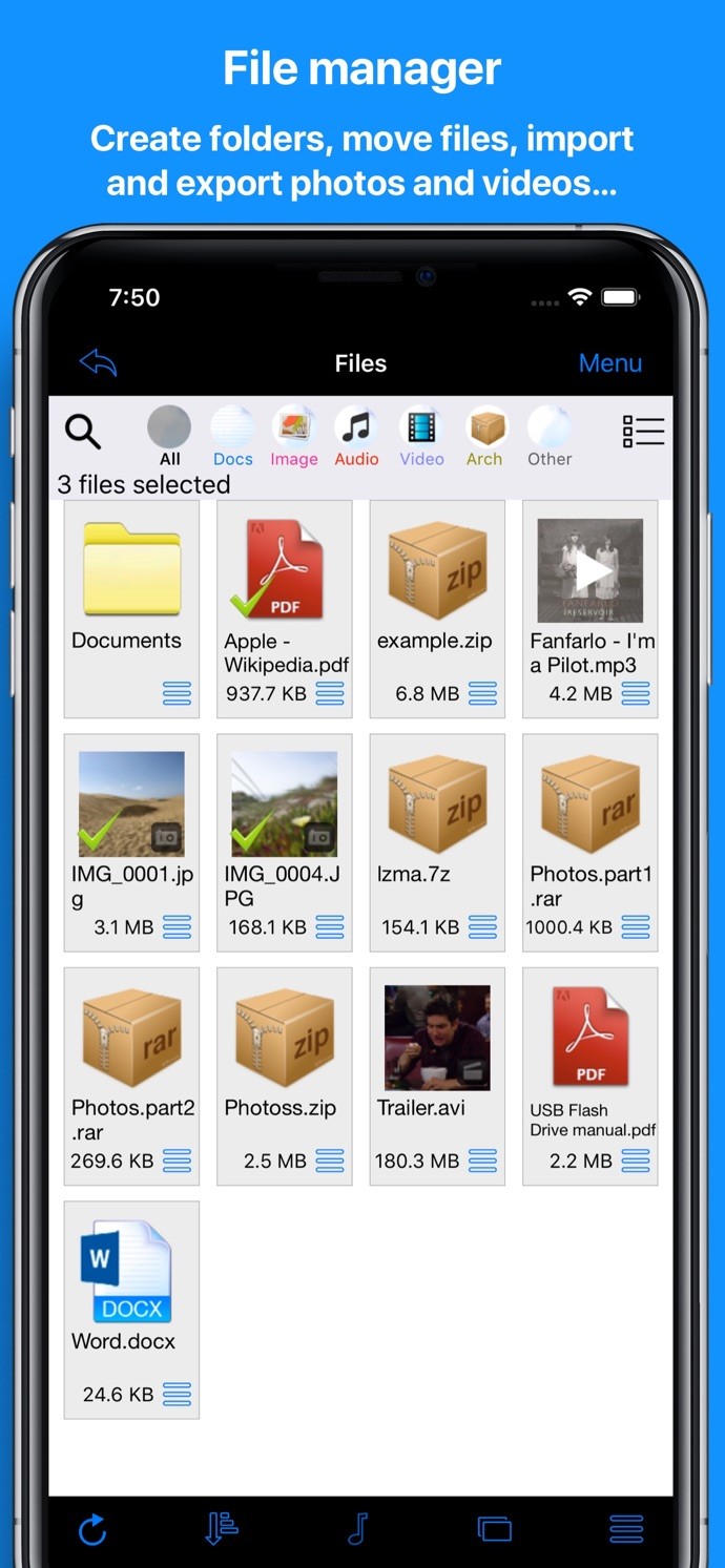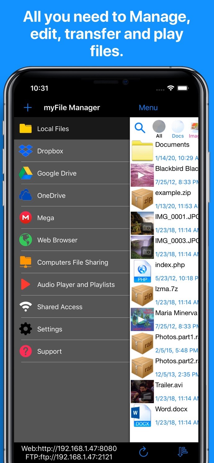 My File Manager allows to store, view and manage files on your iPhone or iPad. Transfer files from your PC and other applications, such as mail. It also allows you to download files, access your accounts in the cloud, import photos and videos from the library and much more...