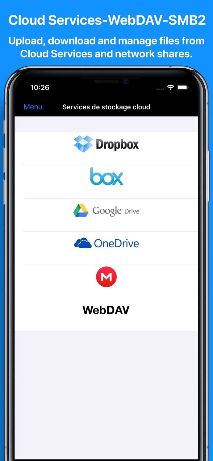 - Access your Dropbox, Mega, Box, Google Drive, OneDrive, Mega or WebDAV accounts from a single app.