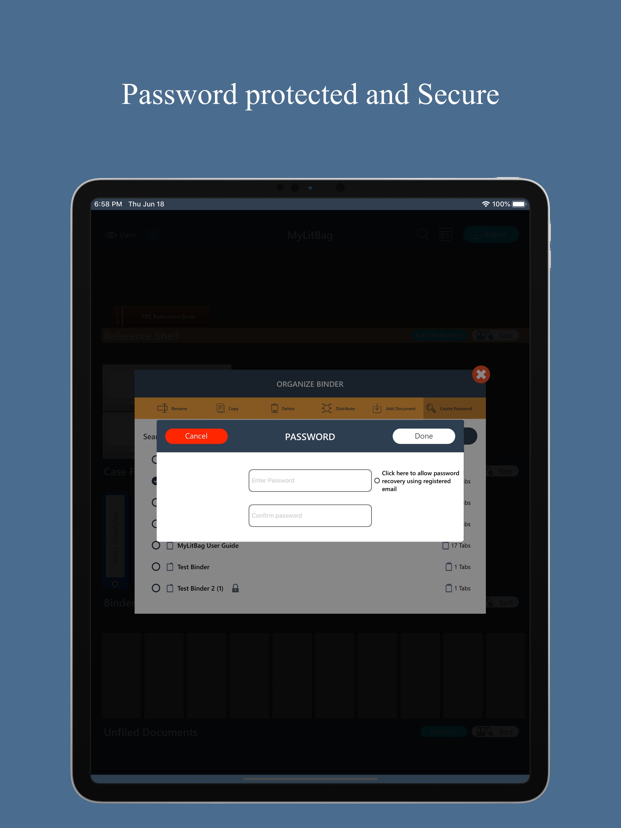 MyLitBag makes the ideal document management app for law firms as it improves productivity, communication, saves time and its cost effective. A physical 3” binder can hold 600 pages and cost hundreds of dollars to compile, copy, or send to a colleague or client. A litigation bag can hold 4 binders and a case files up to 10 binders. Using MyLitBag, your iPad can hold the equivalent of thousands of password-protected legal document binders, that can be securely distributed in minutes, and you can lift it with two fingers.