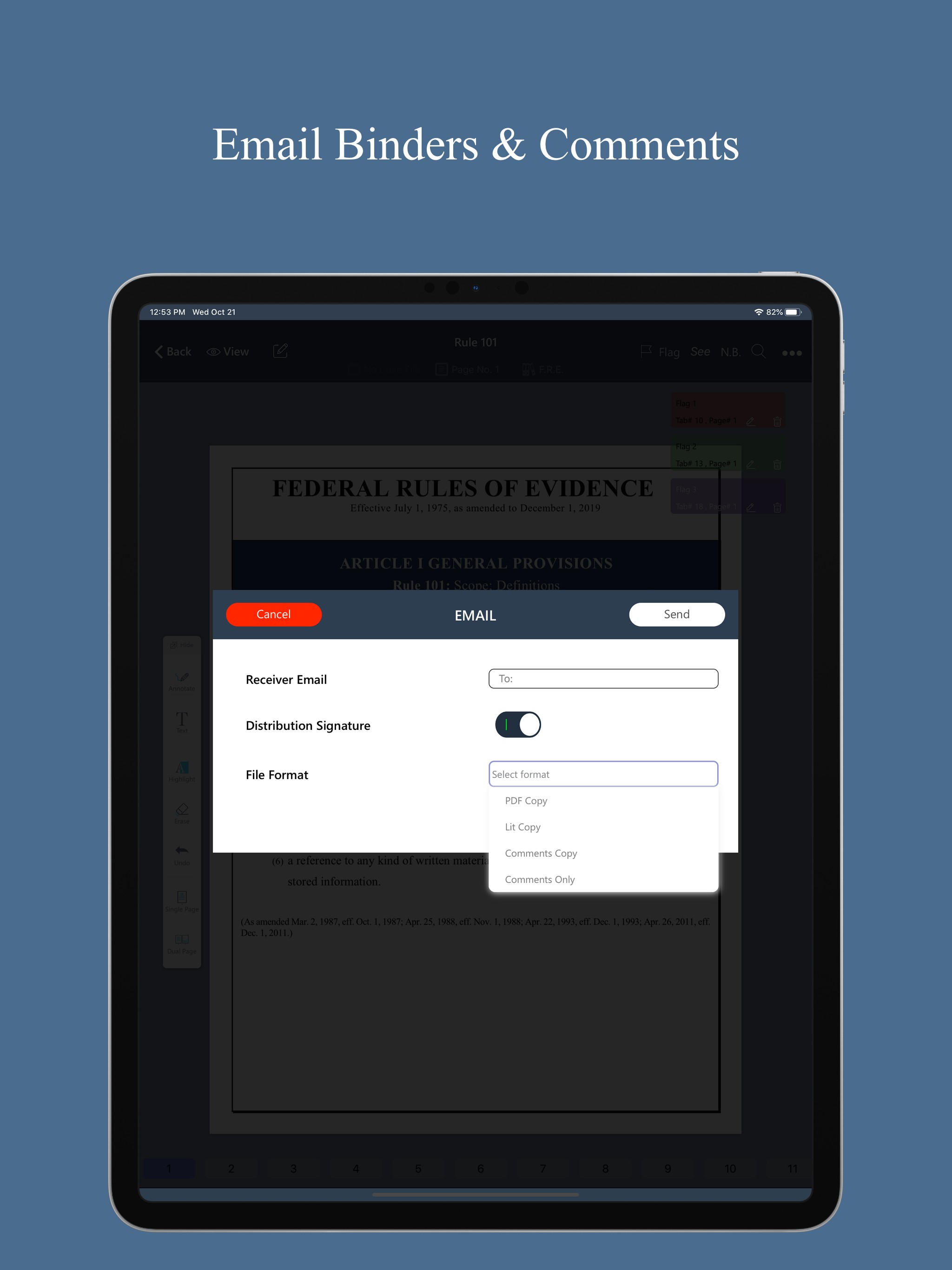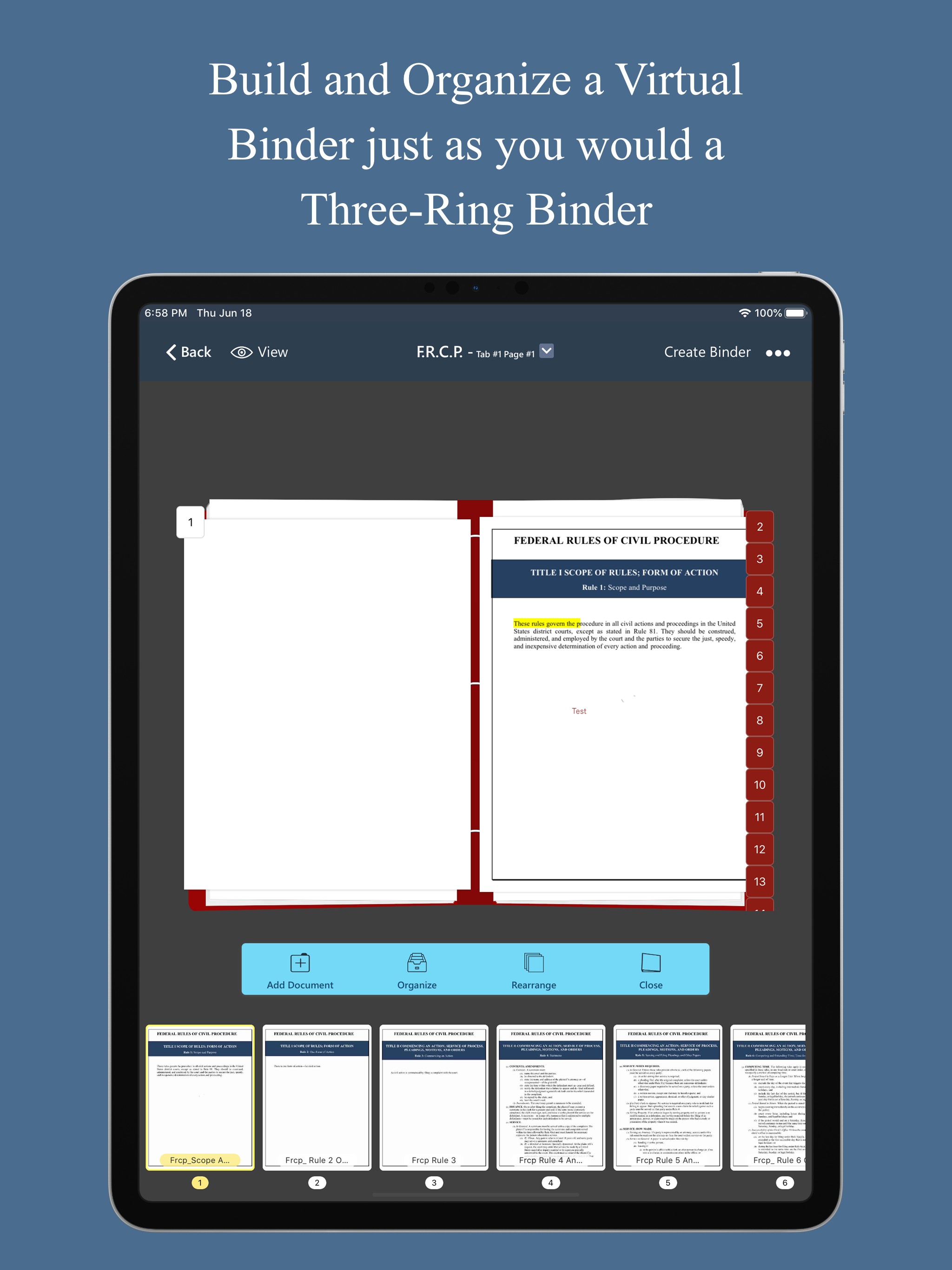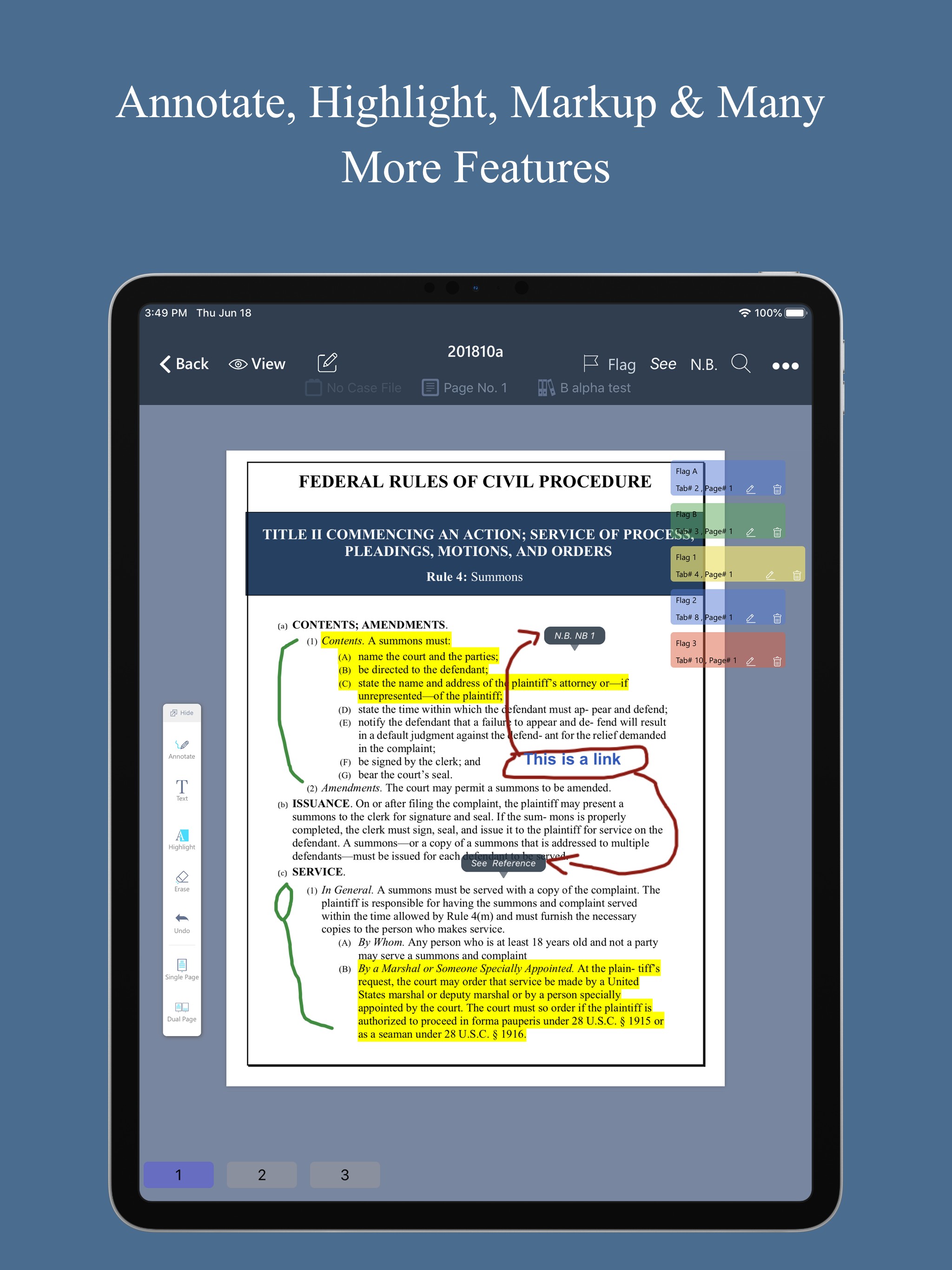 MyLitBag is an IOS-based Ipad digital binder app that allows users to replace and share their physical binders of Legal documents with secure, password protected virtual litigation binders of PDF documents and case files. Designed by and for a litigator’s use, MyLitBag provides the same attributes & functionalities as creating and using a physical binder, such as PDF document markup, PDF document annotation, flipping between tabs in a binder, and flagging important pages for immediate reference, and it adds functionality with active internal “See” and “Nota Bene” reference links. Comes with free copies of the Federal Rules of Evidence and Federal Rules of Civil Procedure for you to use.