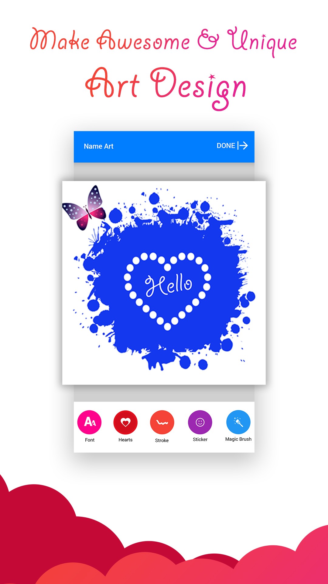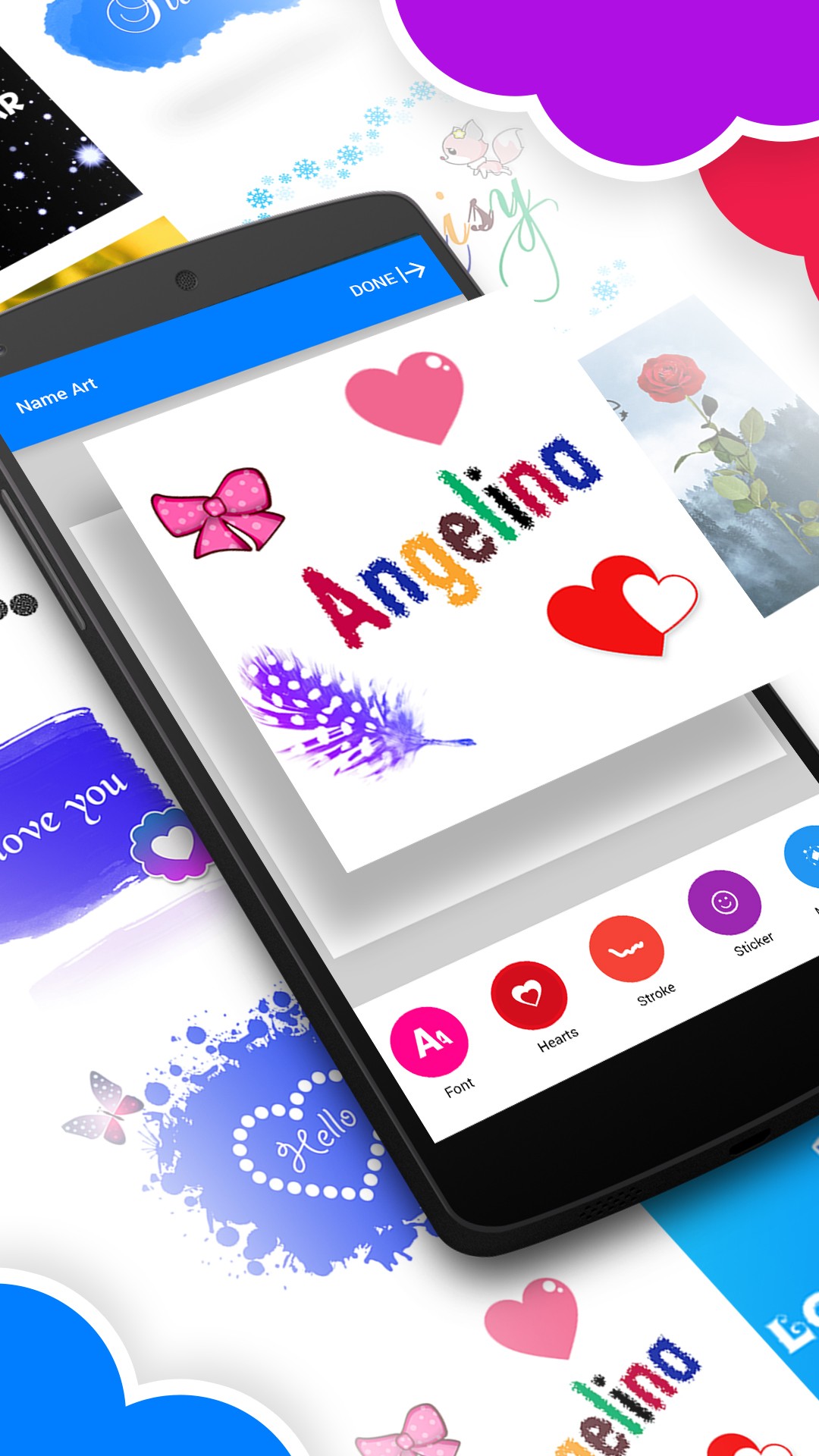 * Decorate text with different colors and add shadow to it, choose the right opacity for name. Tools that blend in and make this name art the best name art app around.