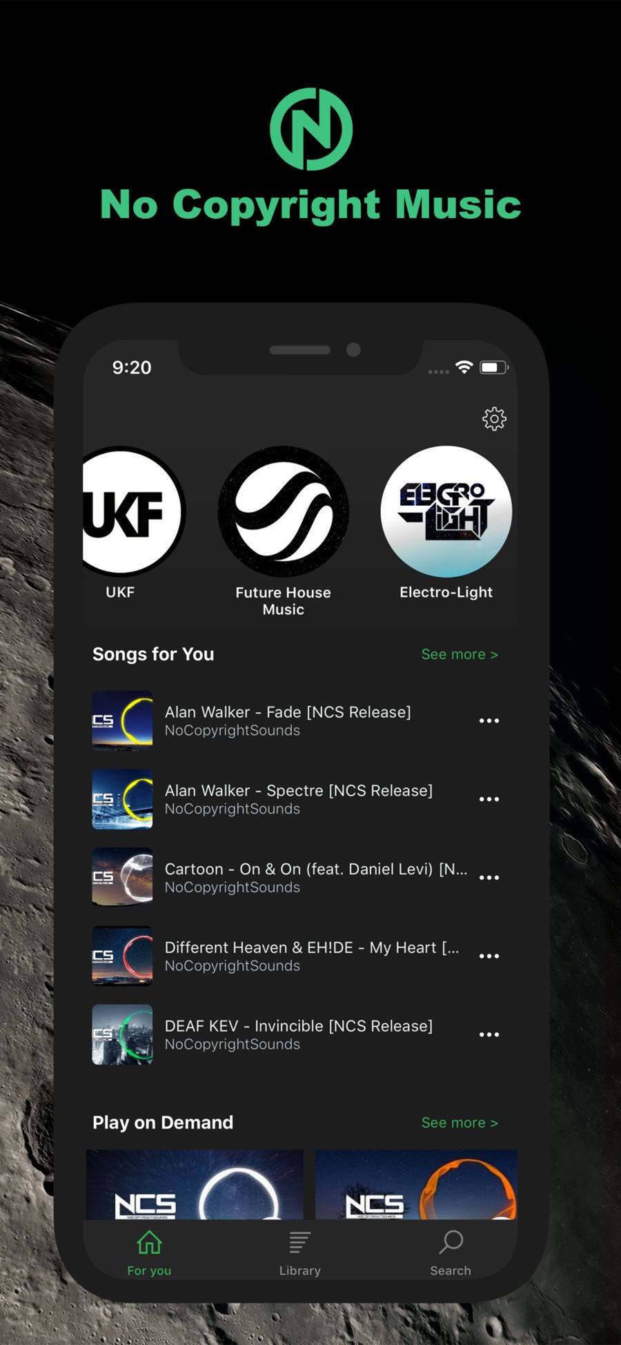 NO.C - No Copyright Music is a music player, It will connect you with free, nocopyright music library.