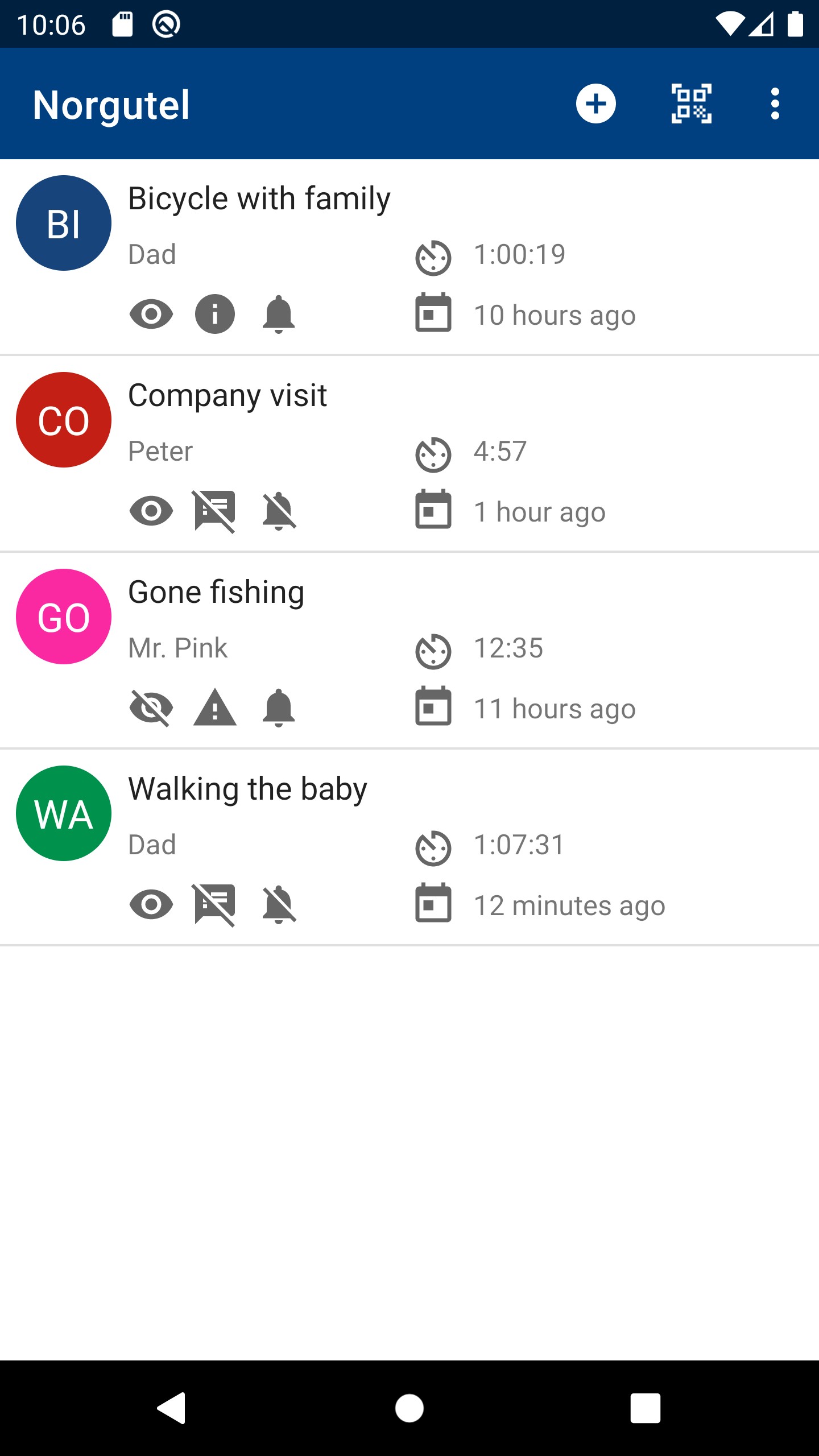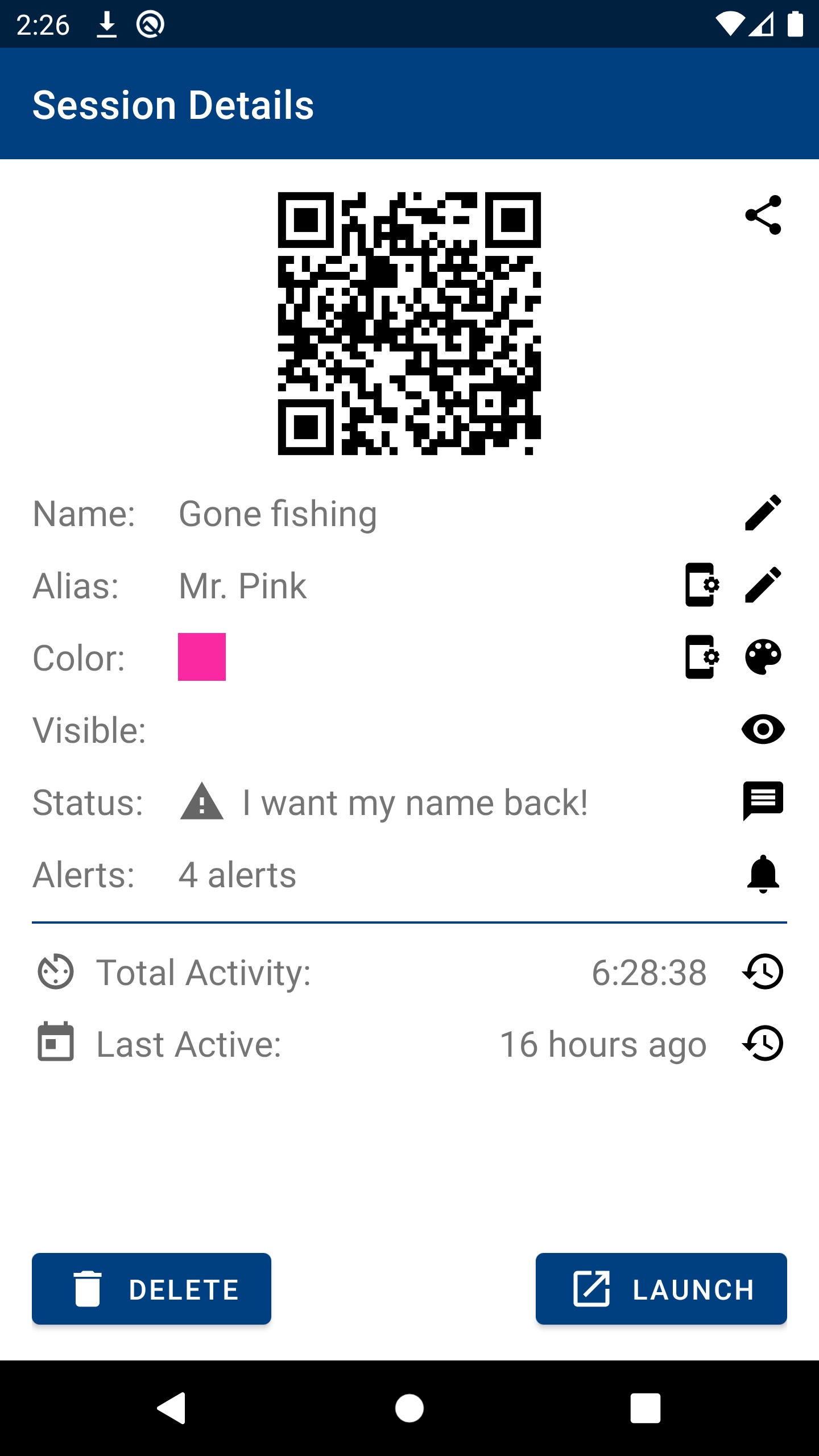 Each QR code is linked to a unique Norgutel session. A session is alive as long as it has active participants. Sessions never expire; you can use a QR code indefinitely to revisit an activity with the same or potentially extended participants - it's your choice with whom you share. If you want to start a clean session, just generate a new QR code and forget the previous one. Norgutel lets you keep multiple session QRs in your app, each having its custom settings such as its name, the alias and color you identify with, or the activated alerts and status message. You may also turn your visibility on and off during a session any time, however your trajectory covered so far and your last known location will remain visible to others.