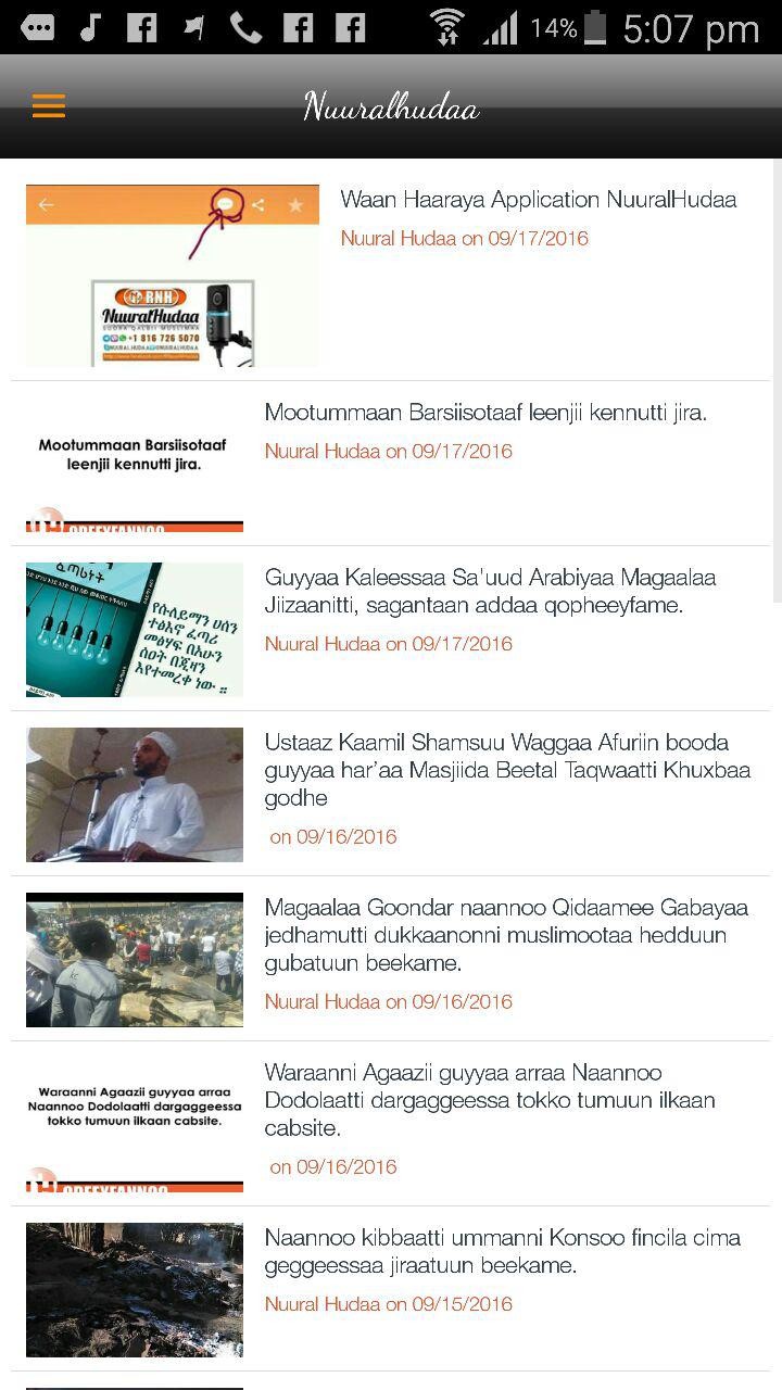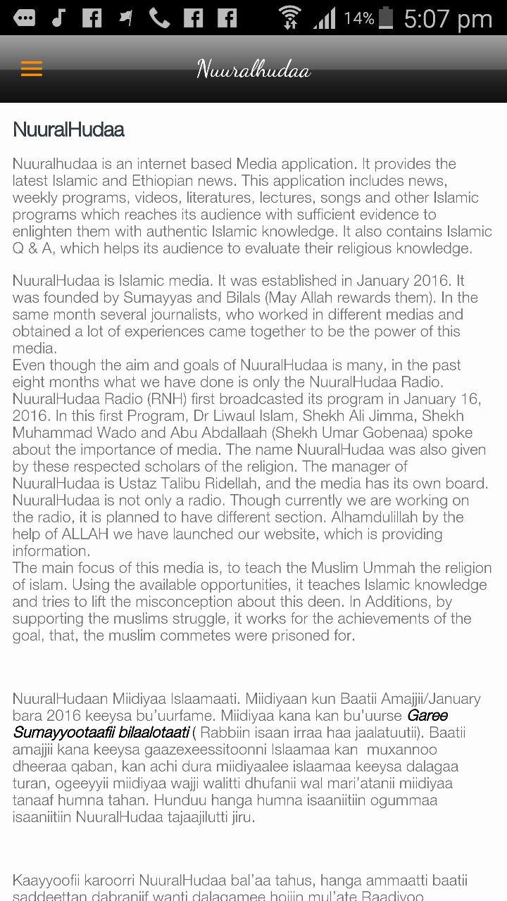Nuuralhudaa is an internet based Media application. It provides the latest Islamic and Ethiopian news. This application includes news, weekly programs, videos, literatures, lectures, songs and other Islamic programs which reaches its audience with sufficient evidence to enlighten them with authentic Islamic knowledge. It also contains Islamic Q & A, which helps its audience to evaluate their religious knowledge.