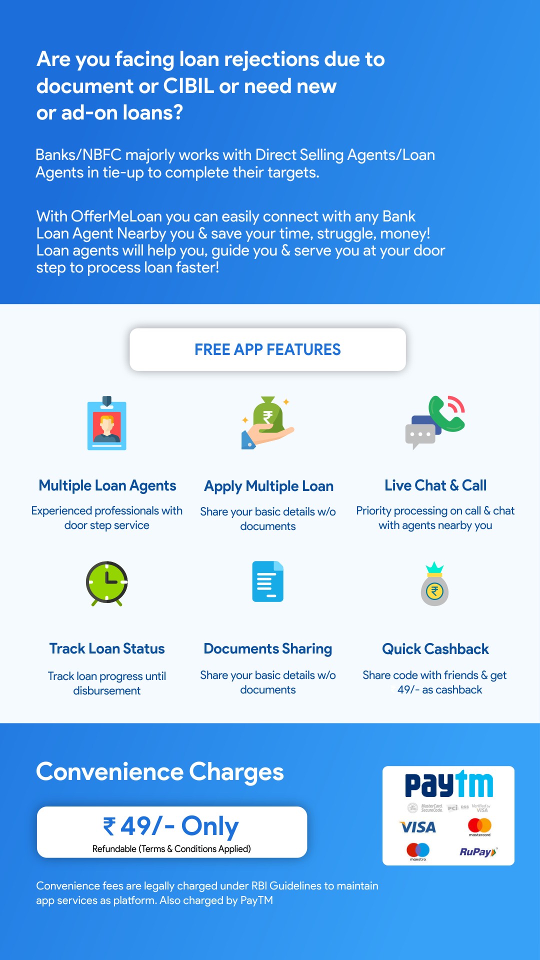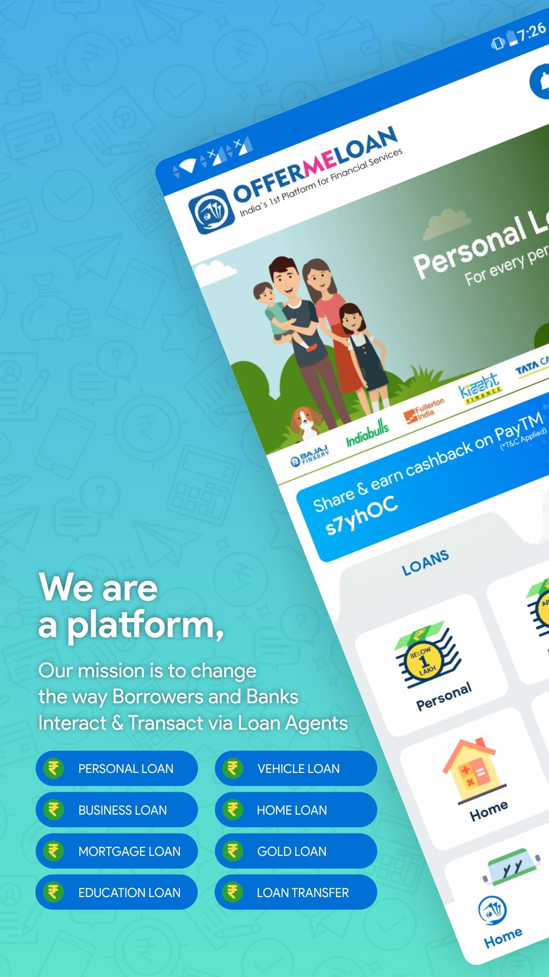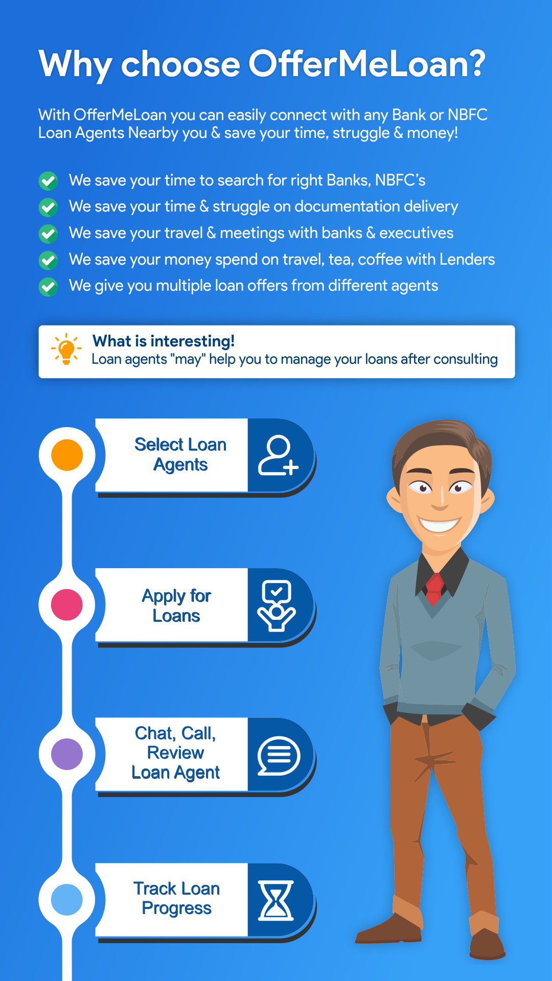 OfferMeLoan, India’s first Platform to help loan seeking borrowers such as Self Employed & Salaried young professionals to save their time, travel & struggle by getting consulting from nearby Bank Certified Loan Agents who can process their loans via Banks & NBFC tie-ups ranging from Rs 1 Lakh to Rs 100 Crore.