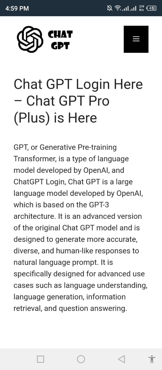 Chat GPT Login and GPT 4 Login to the most advanced and the newest language model from OpenAI. GPT, or Generative Pre-training Transformer, is a type of language model developed by OpenAI, and ChatGPT Login, Chat GPT is a large language model developed by OpenAI, which is based on the GPT-3 architecture.