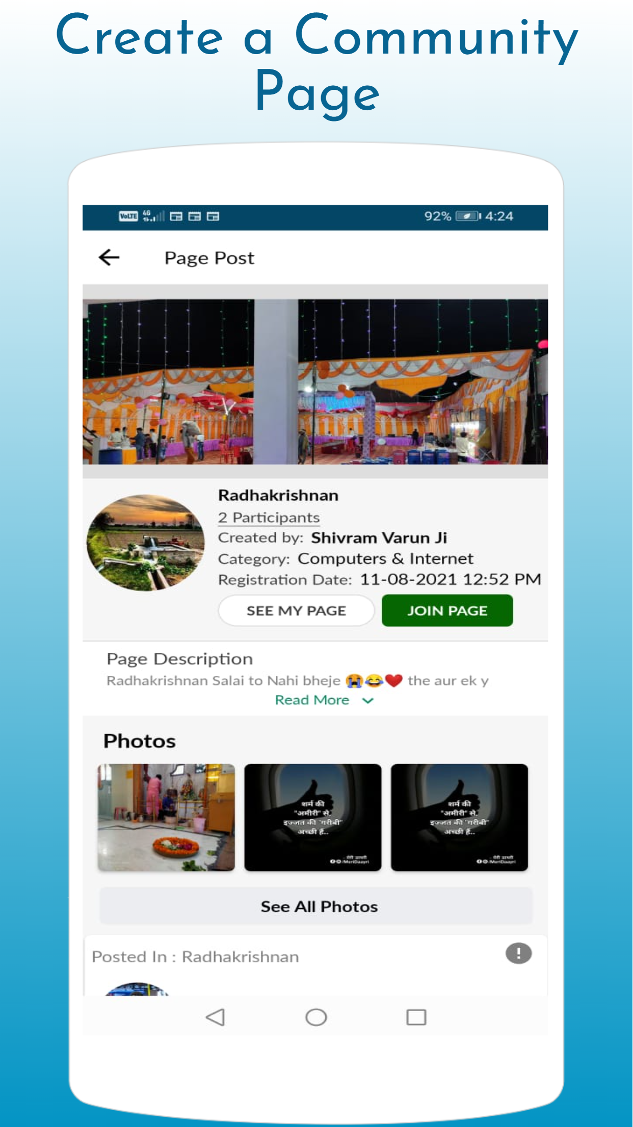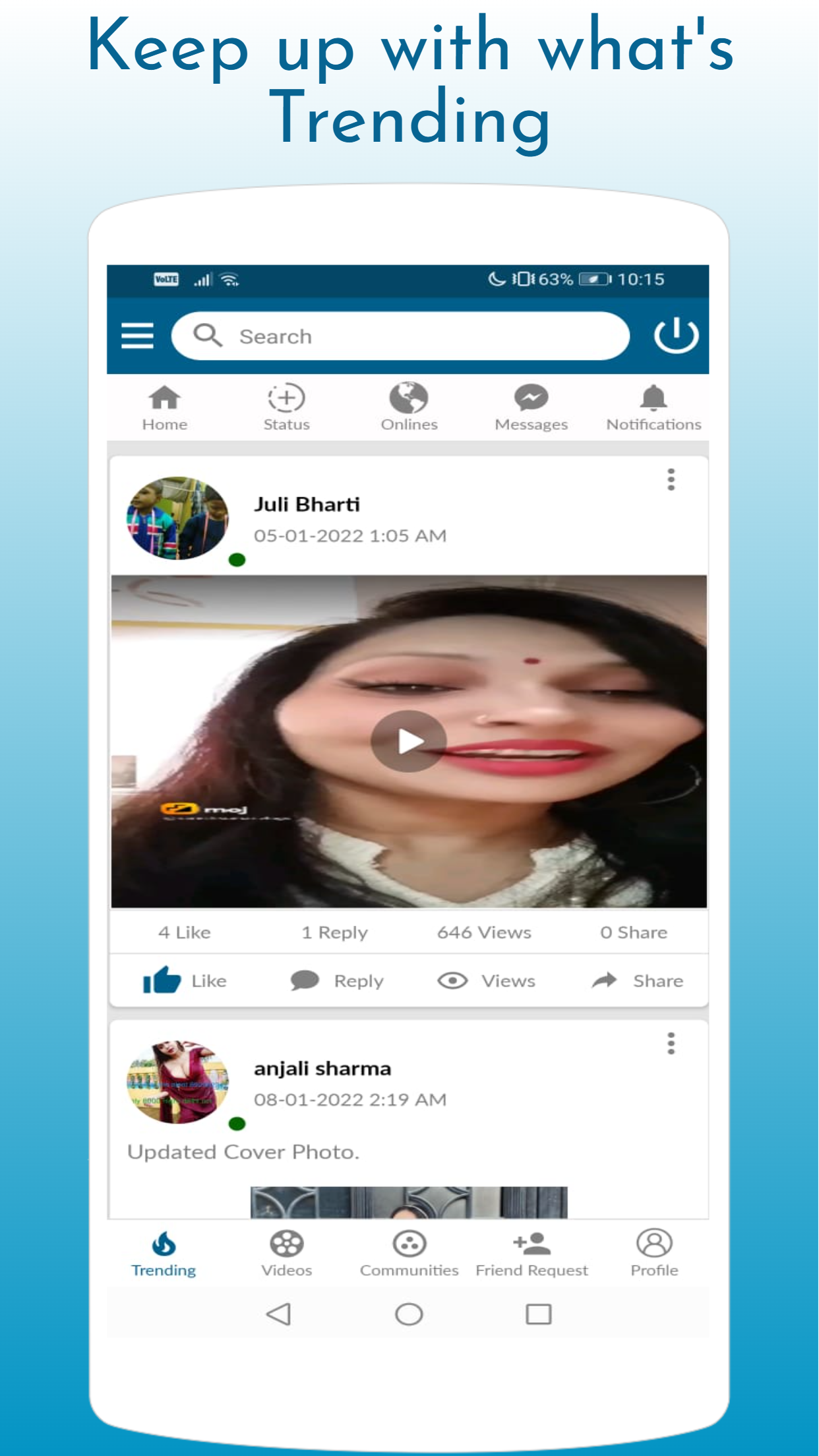 The feed/home is a place to share your thoughts (like photos, videos, audio, document ,etc. ) with the world. Say hello/Hey and connect with everyone. People react on it with various reaction option with comments also.