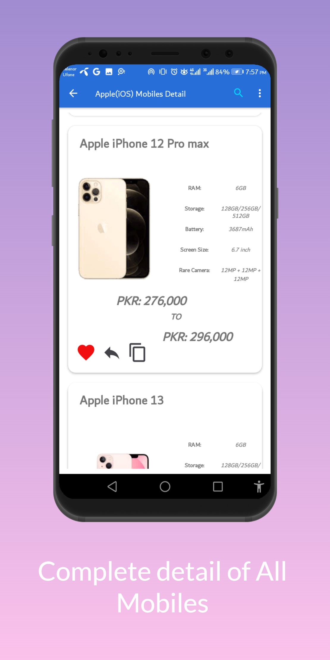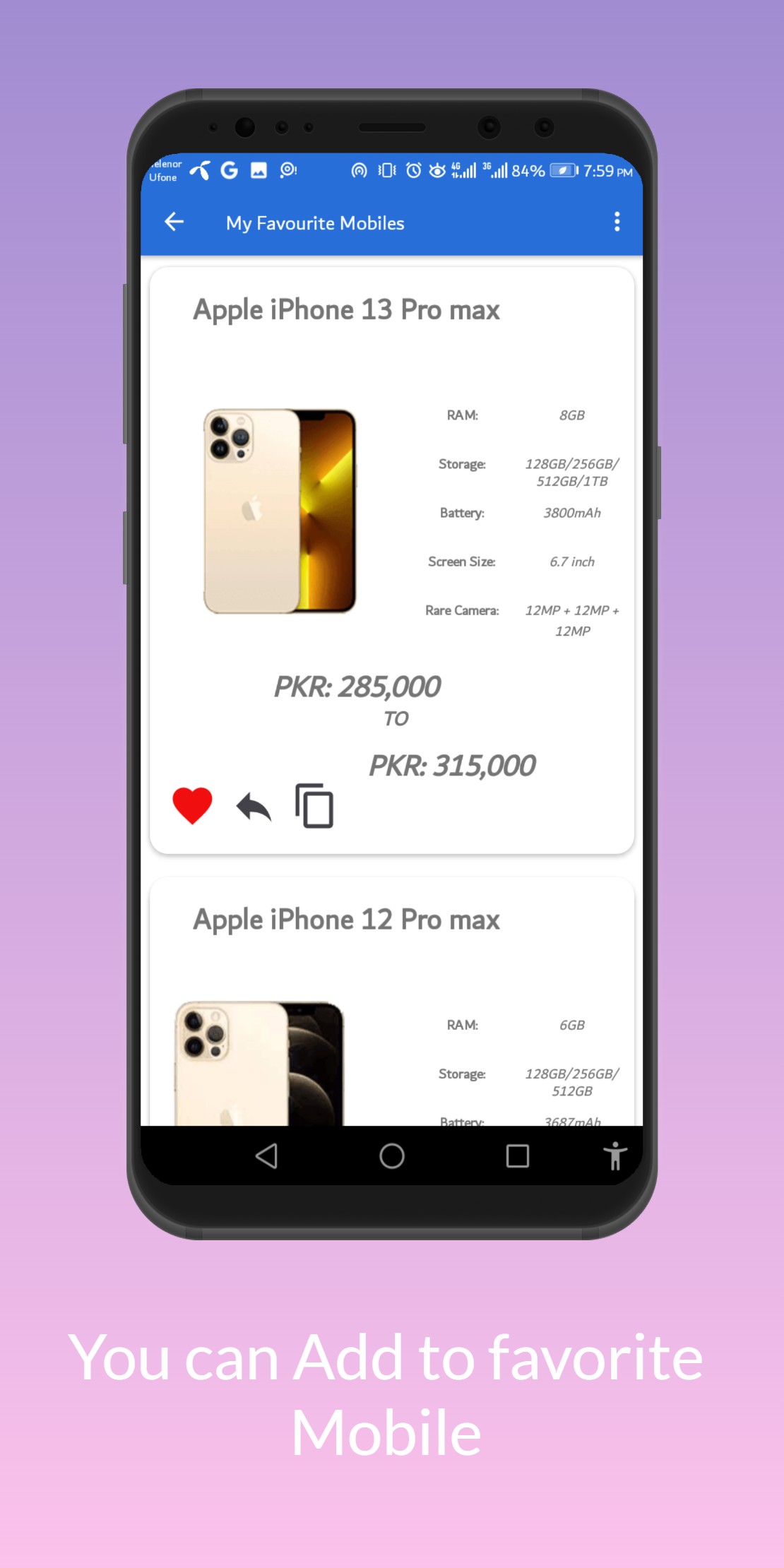 Most interesting and wonderful thing about PakMobile Application is that it has a button named favorite after pressing the favorite button the selected mobile will come in your favorite list and this favorite list can have unlimited mobiles. You can add following mobiles into favorite list: