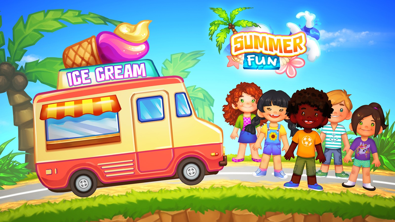 Immerse yourself into the hot and sunny beach and have the most exciting summer fun holiday race! Visit paradise island holiday resort, join your new kids friends playing on the beach: Liu, Darrell, Oliver, Mia, Emma and Charlotte and race with 4 cute summer time racing cars: Ice-cream bus, Doll car, Mrs ship, Greenatic!
