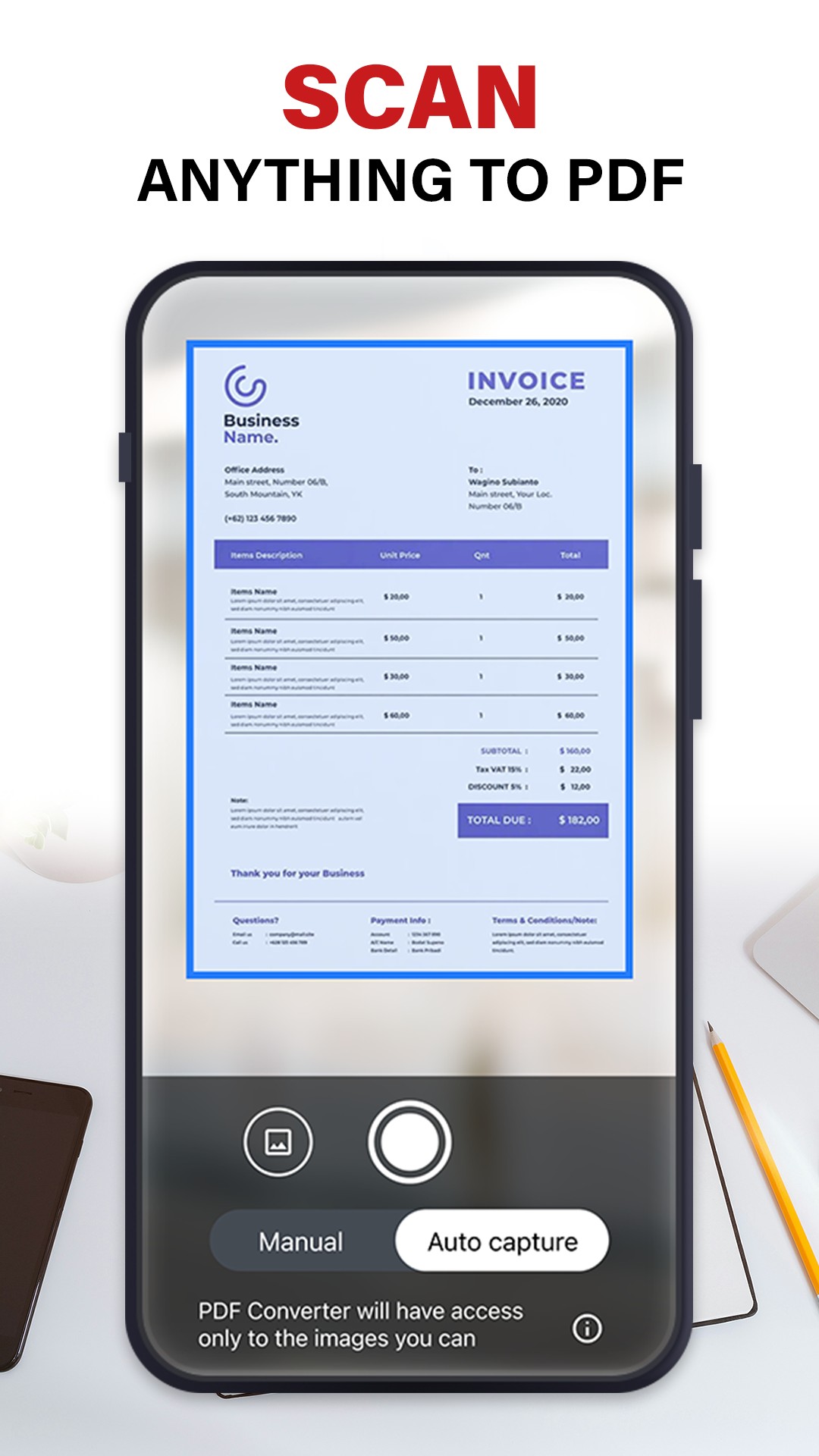Scan receipts, notes, and paperwork using your phone camera and save them as PDF files.