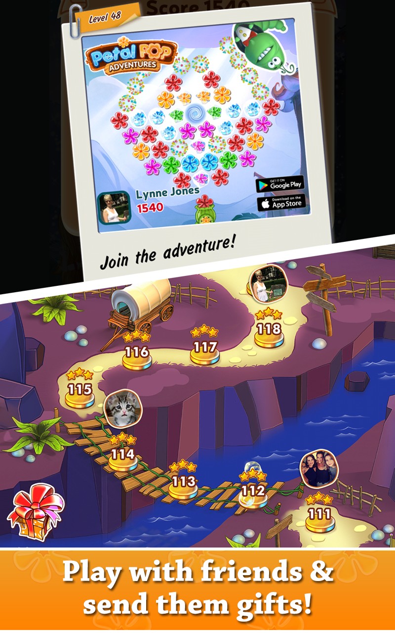 Petal Pop Adventures is not just a fun game to play on your own, but it’s also great for playing alongside your Facebook friends as you can request or send lives and boosts to each other. Or if you’re feeling competitive, cement your bubble shooter skills at the top on the leaderboard and share your score on Facebook for all your friends to see!