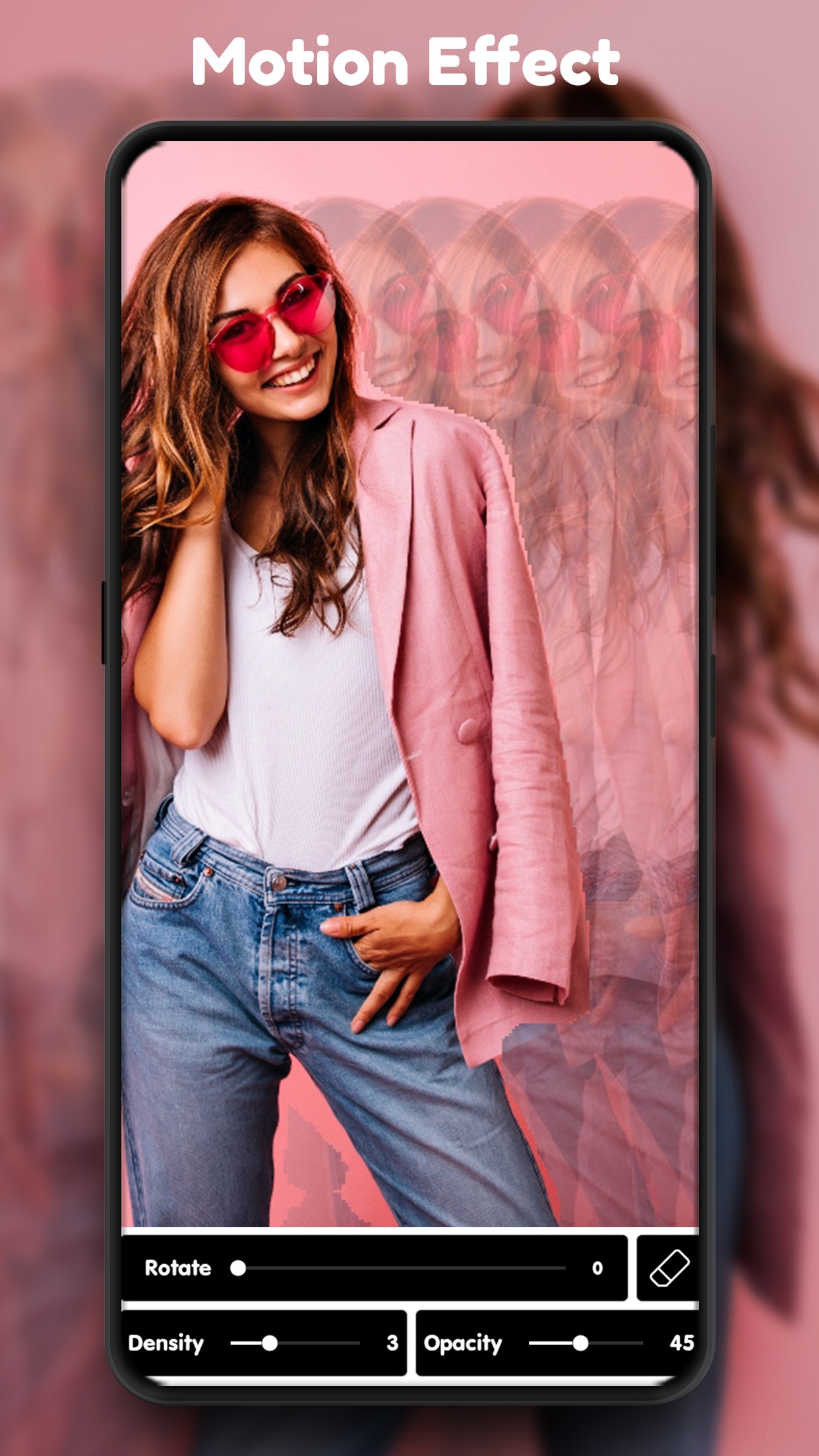 The photo editor tool also includes legendary motion effects, black and white effects, and blur effects with different controls and background blur options.