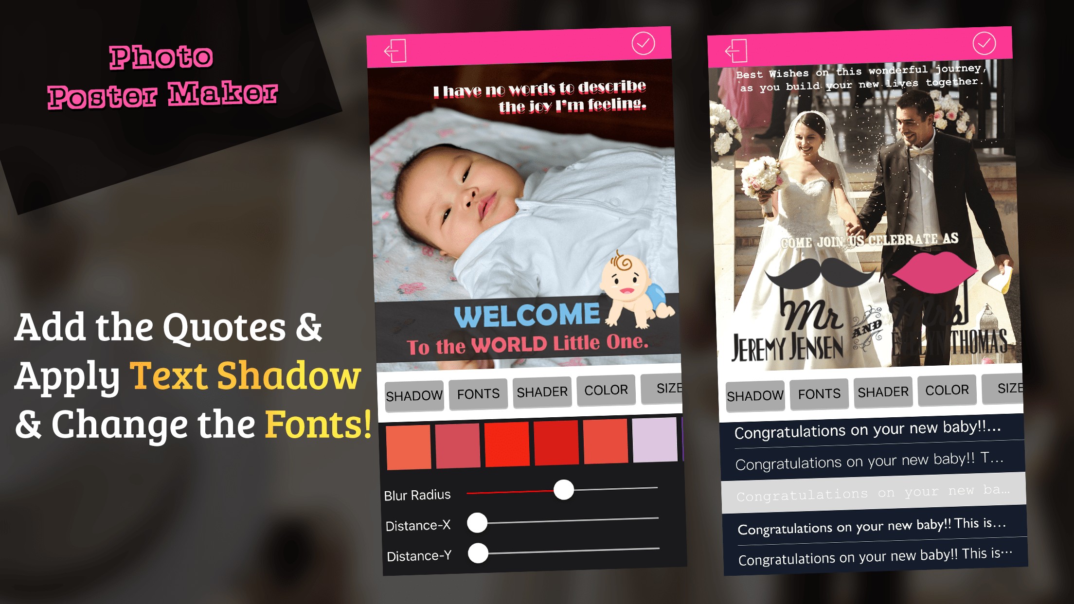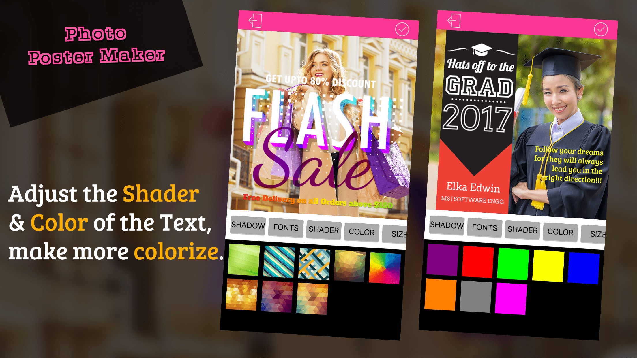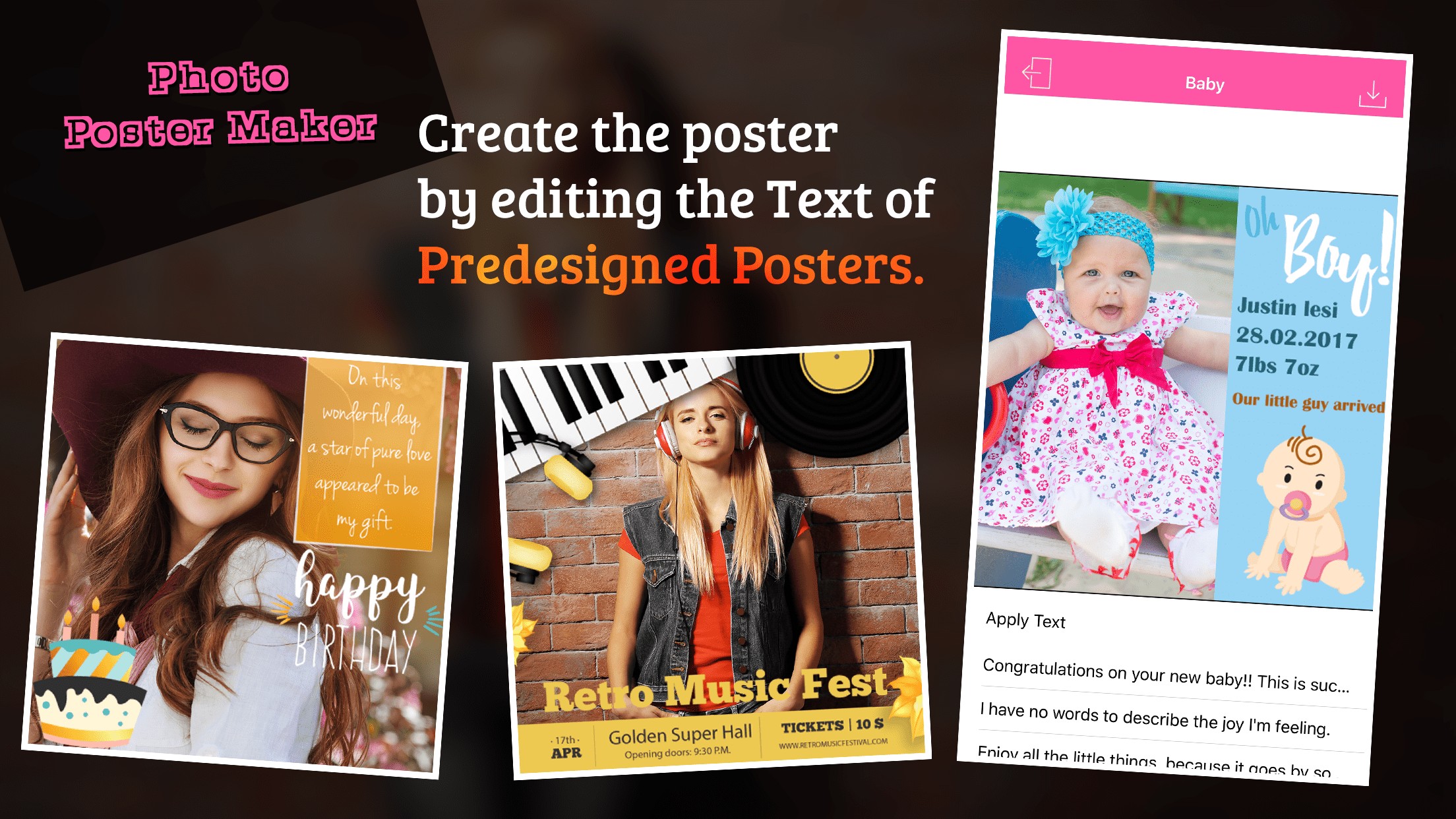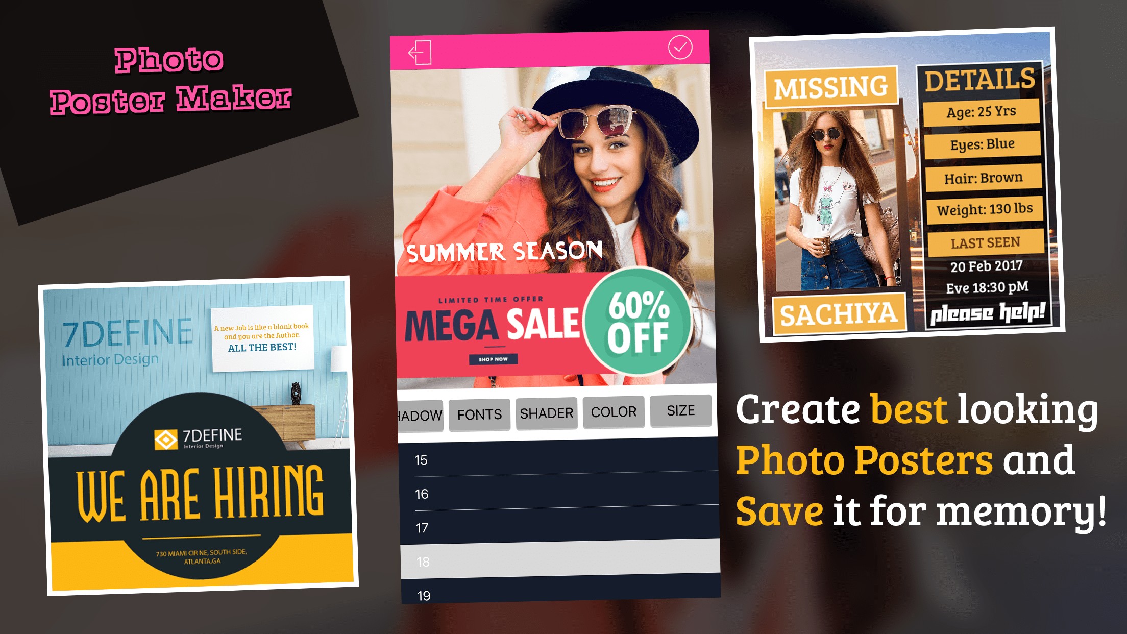 Transform your original image into exquisite posters. This app provides multiple posters such as Baby, Graduation, Wedding, Birthday, Sale, Anniversary, Party, Missing, etc.