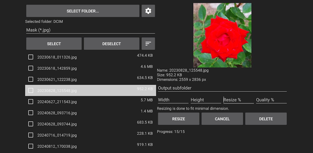 Photo Resizer app allows you to resize (reduce) single or multiple photos by width, height, or percentage. You can also adjust image quality, preview photos, and delete selected ones. Resized images can be saved in the original folder or in a specified subfolder. Supported file formats: JPEG, JPG, PNG, WEBP.