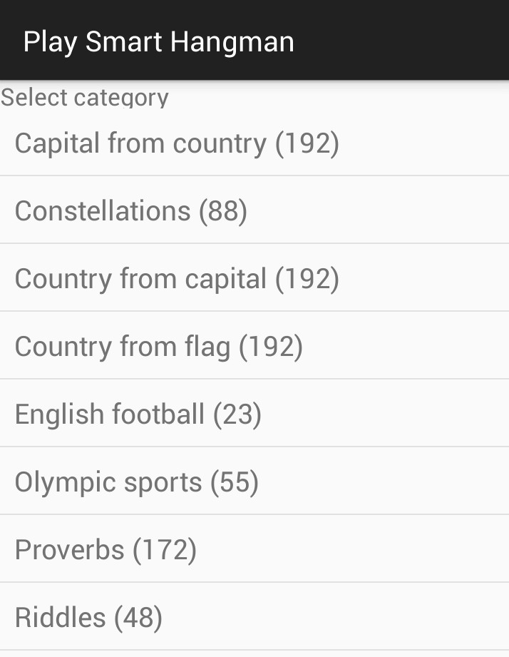 The categories that includes are: "Attractions from all the world", "Books", "Box Office stars", "Capital of country", "Constellations", "Country from flag", "Country from capital", "English football", "Famous people","Movies", "Olympic sports", "Proverbs", "Riddles" and "Walt Disney movies".