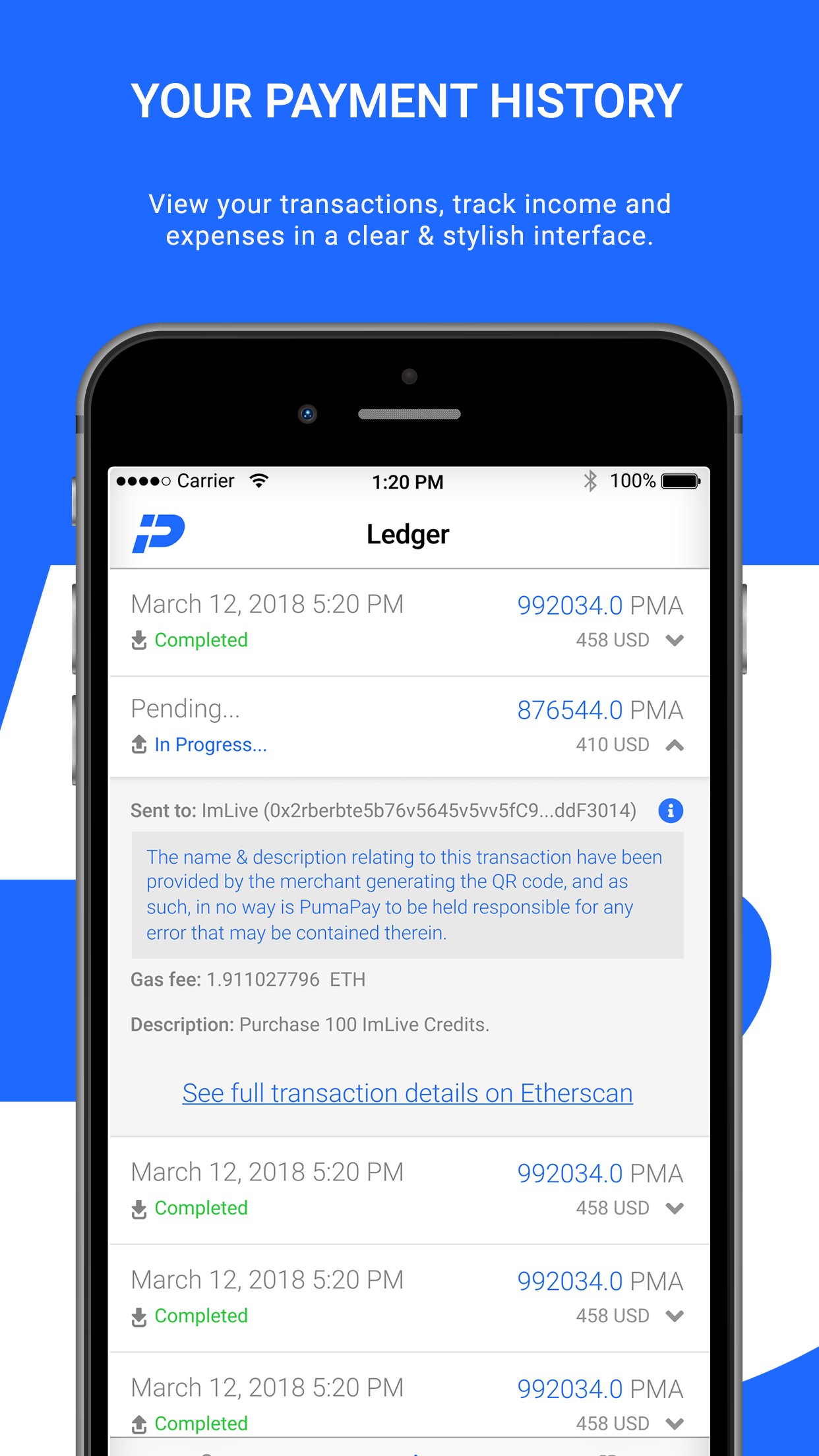 • Send and receive payments in PumaPay (PMA) and Ethereum (ETH).