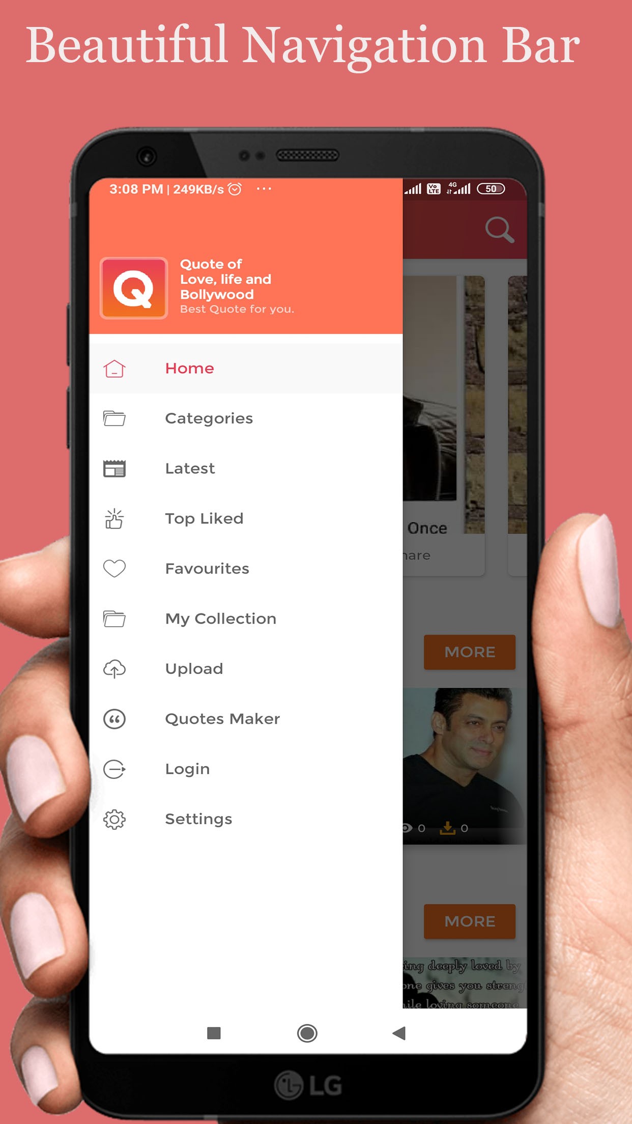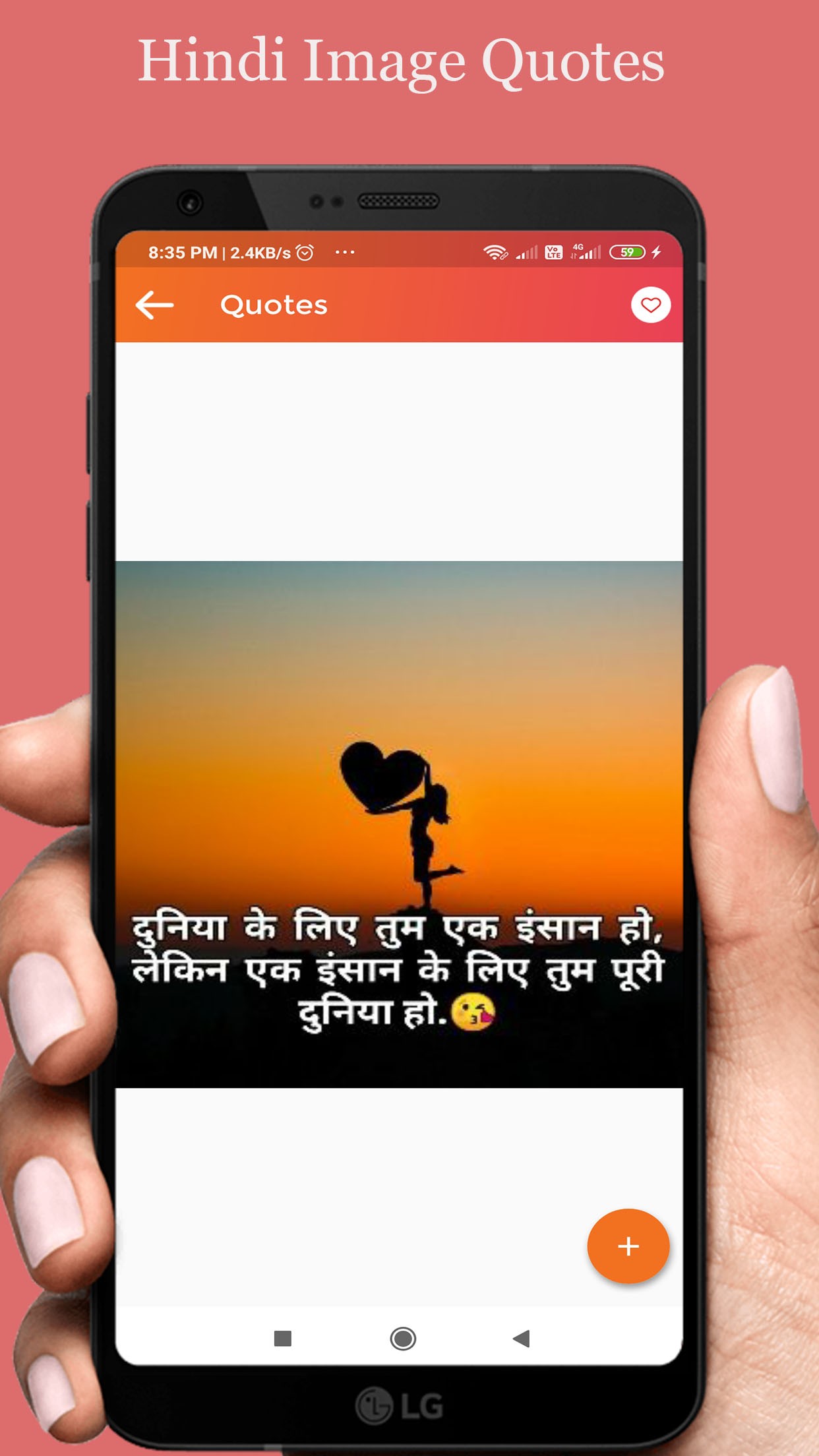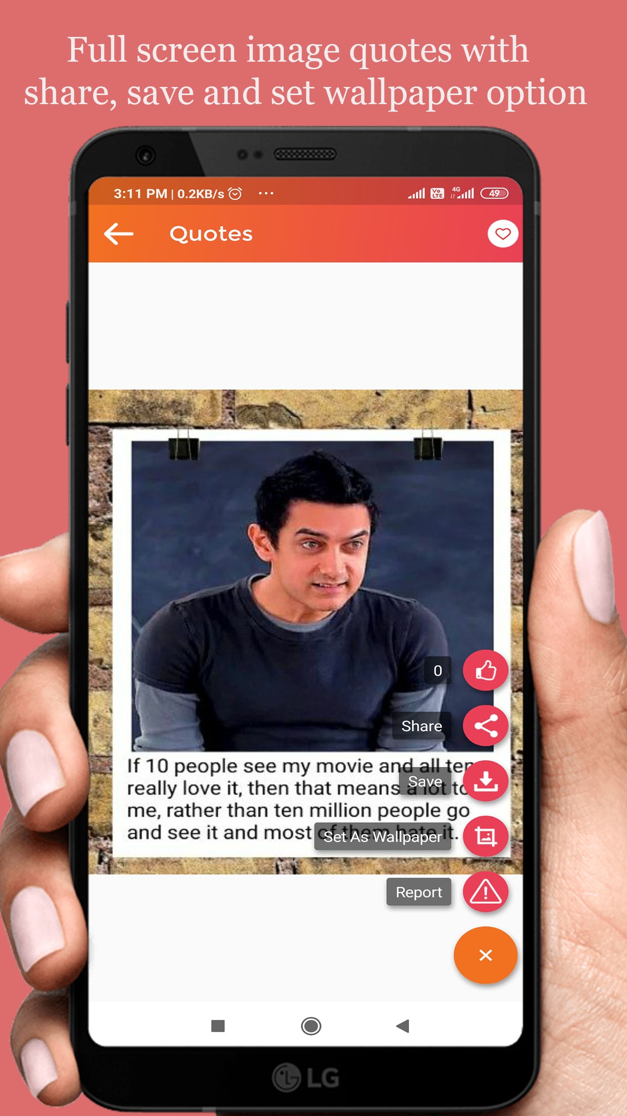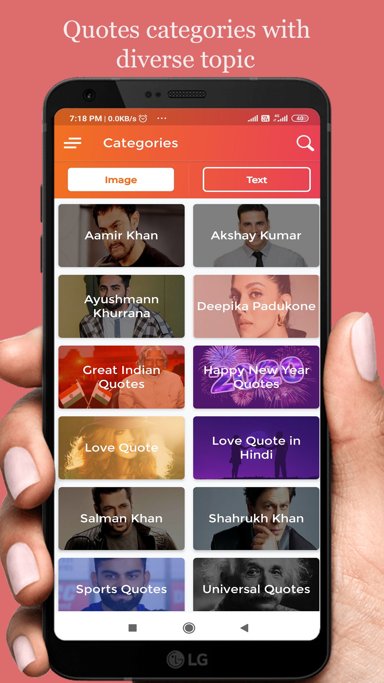Large collection of Quotes on love, life, motivational, sport, Bollywood, etc., with beautiful design and excellent user interface (UI) that gives you one touch options for save, share and set wallpaper along with additional options for creating your own quotes.