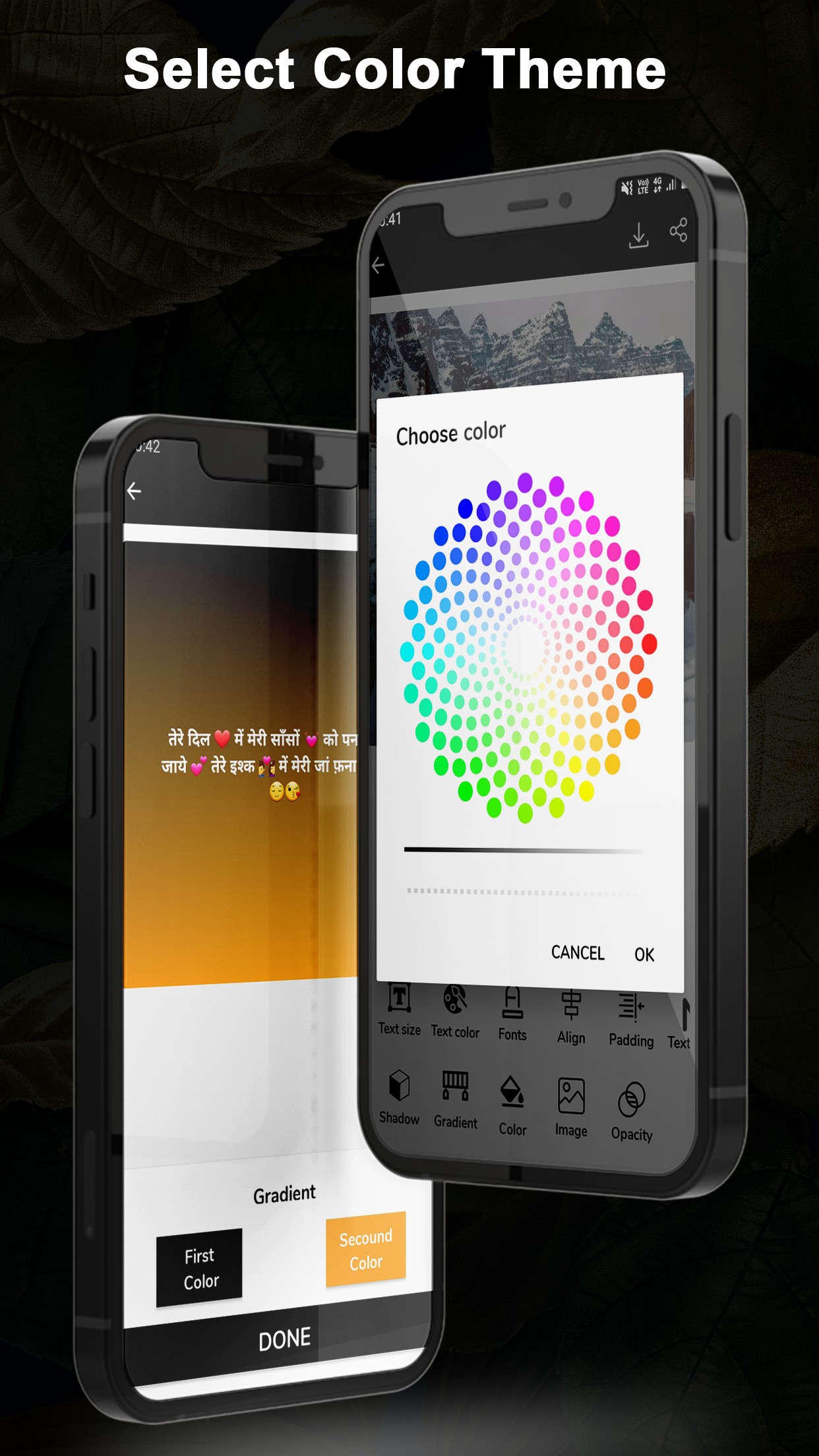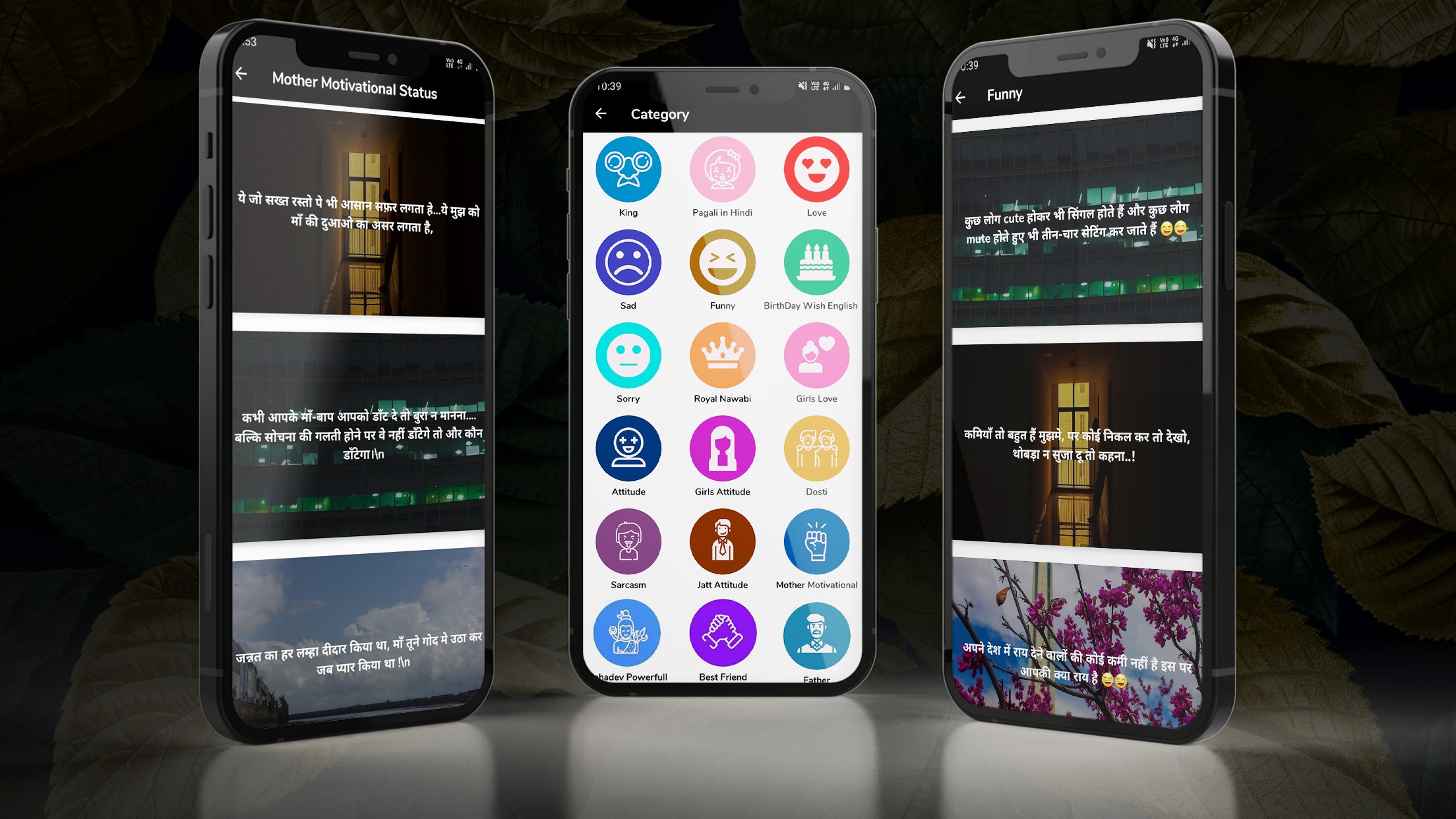 Categories included in quotes and daily status are King Status, Pagli in Hindi, Love Status, Sad Status, Funny, Birthday wish in English, Sorry Status, Royal Nawabi quotes, Girls Love, Dosti, Jatt Attitude, Girls Attitude, Mother Motivational, Father Status, Rajputana Status, Thakur Quotes, Mahadev Powerfull Status, Best Friend, Haryanvi Swag, Choudhary, Marathi Shayari, Birthday Messages and Nepali Shayari. The app allows you to add text on images, customize the font style and size, and choose from tons of predefined fonts.